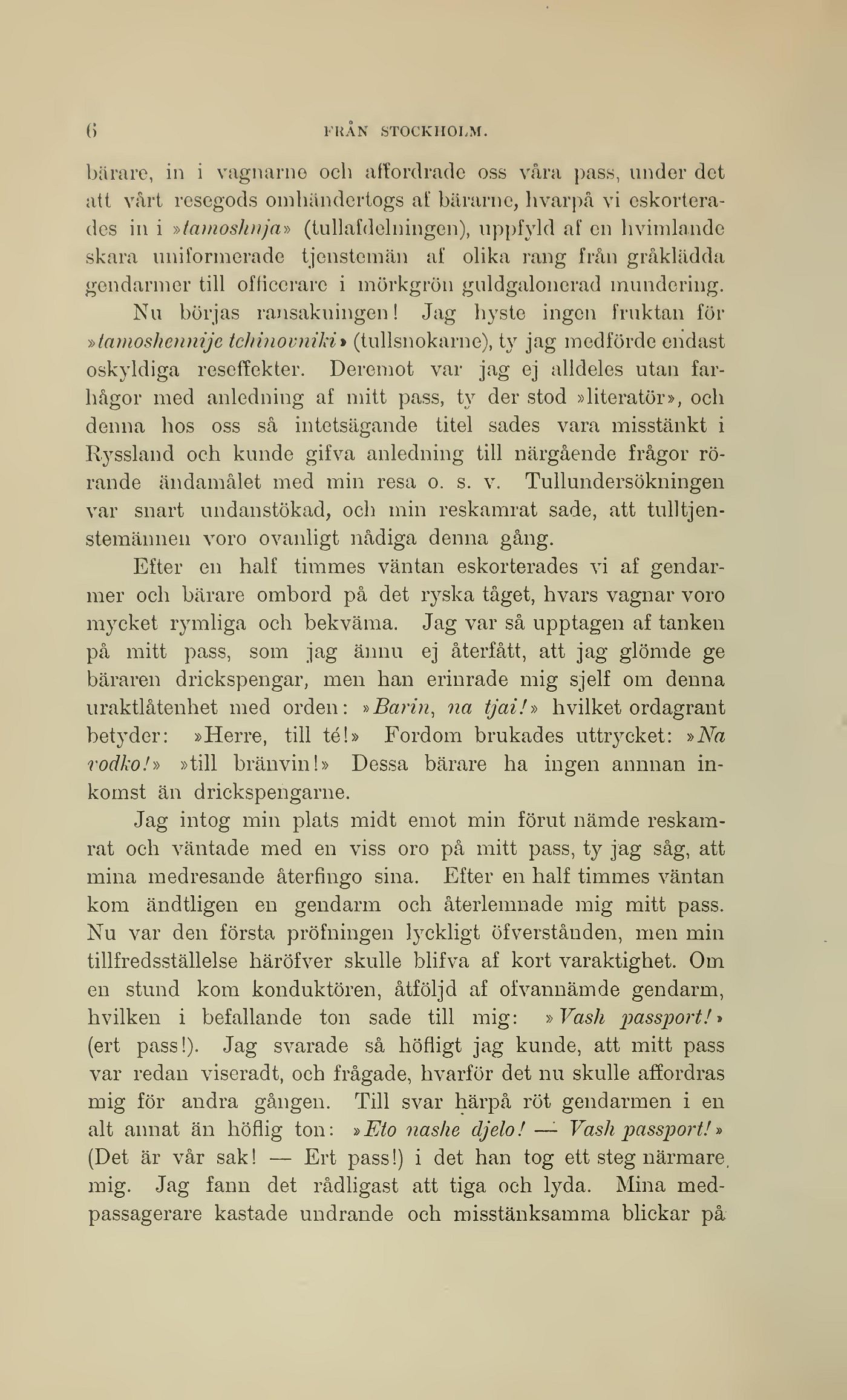 hvilken i befallande ton sade till mig: »Vash passport!»
