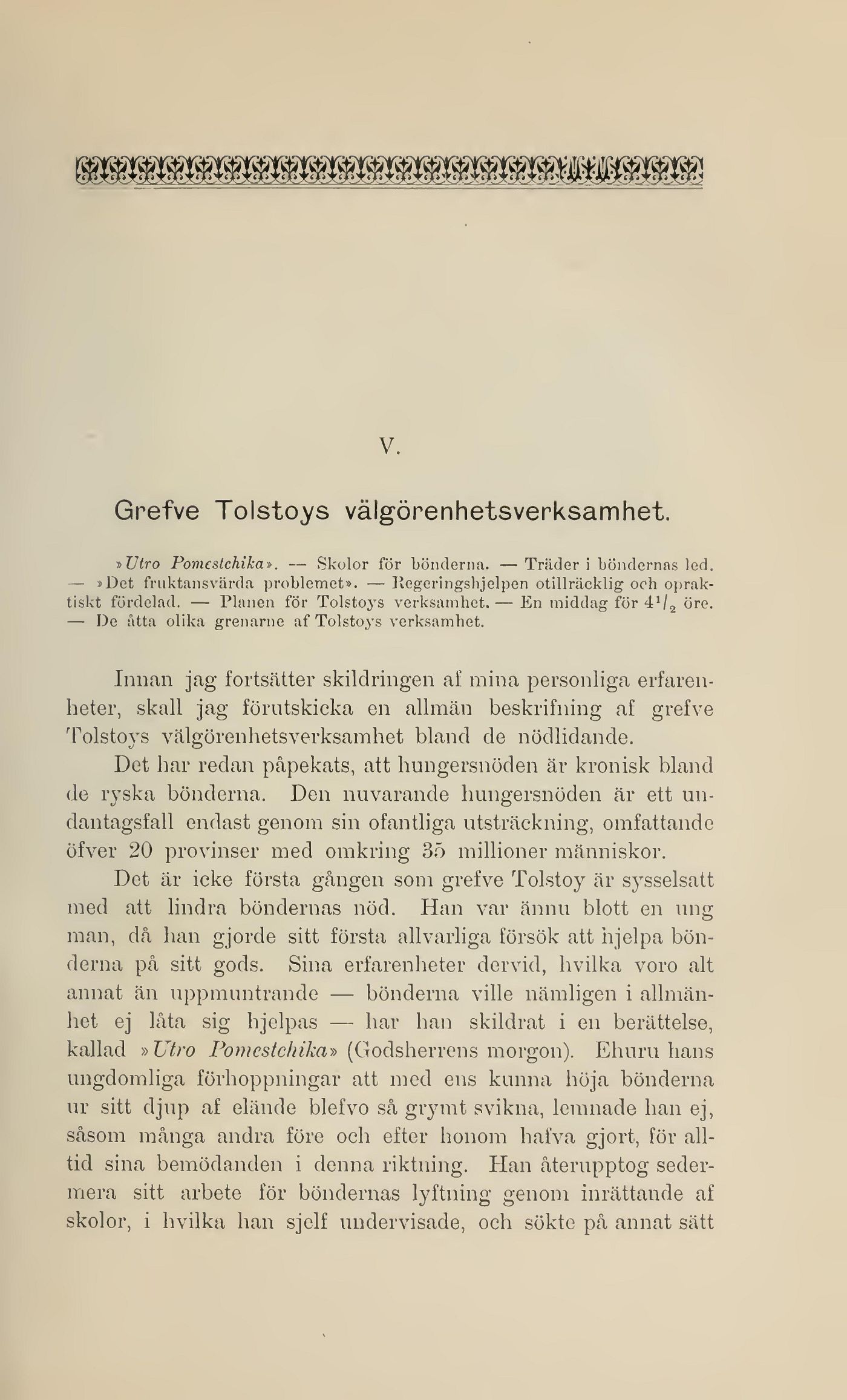 - V. Grefve Tolstoys välgörenhetsverksamhet
