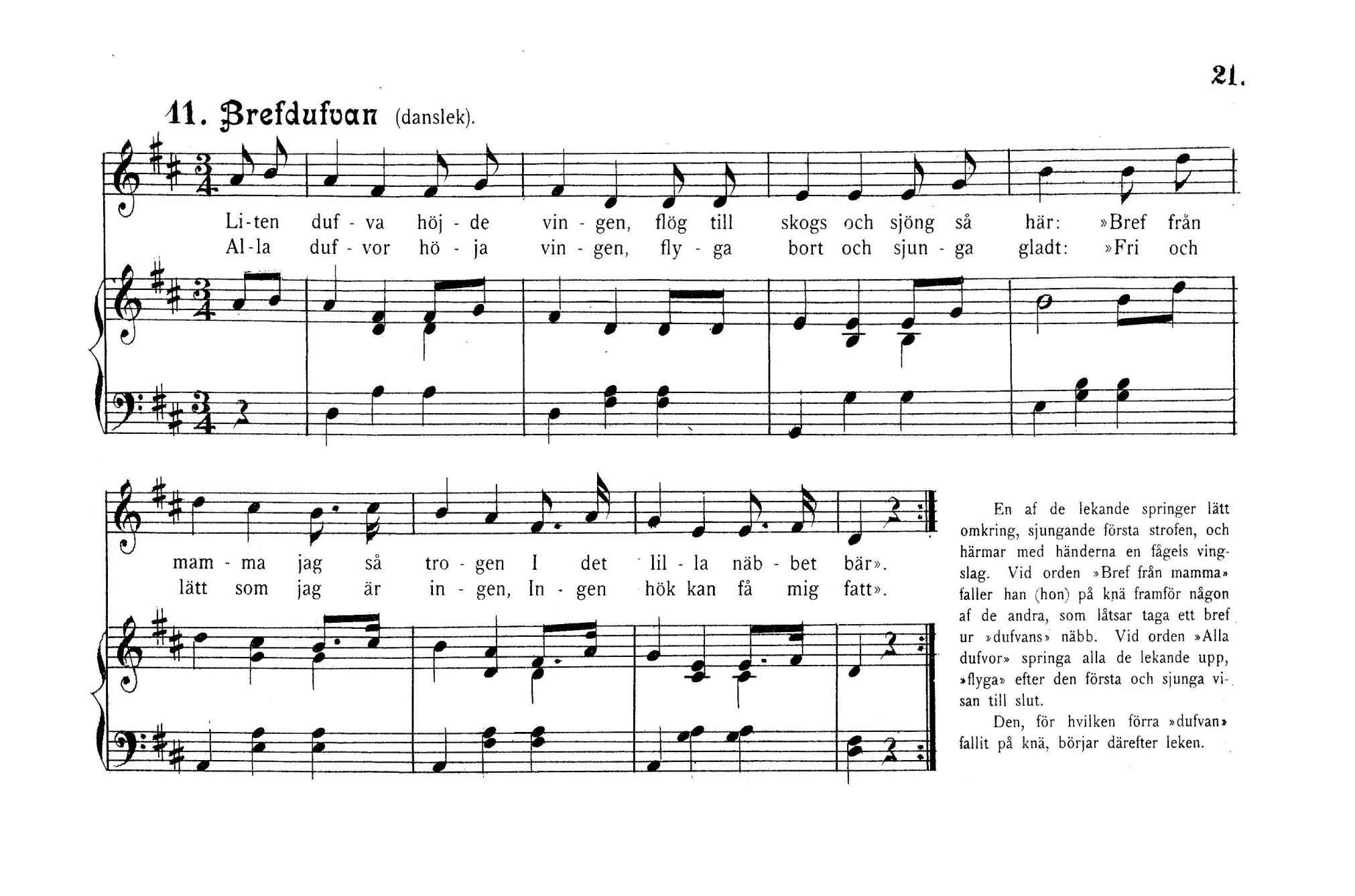 Li-ten duf - va höj - de vin - gen, flög till skogs och sjöng så här: »Bref från