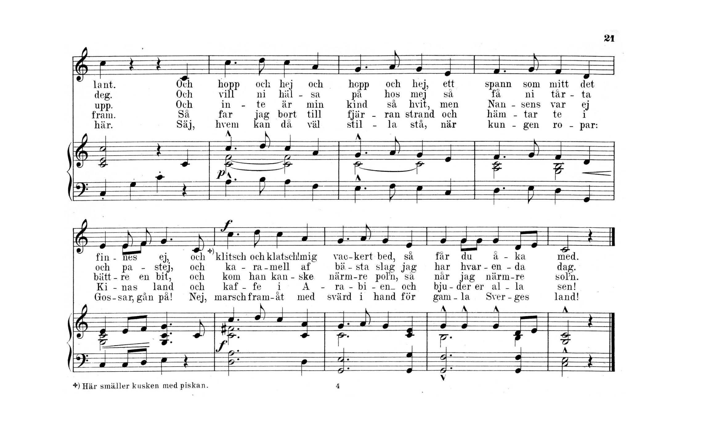 Gos-sar, gån på! Nej, marschfram-åt med svärd i hand för gam-la Sver - ges land!