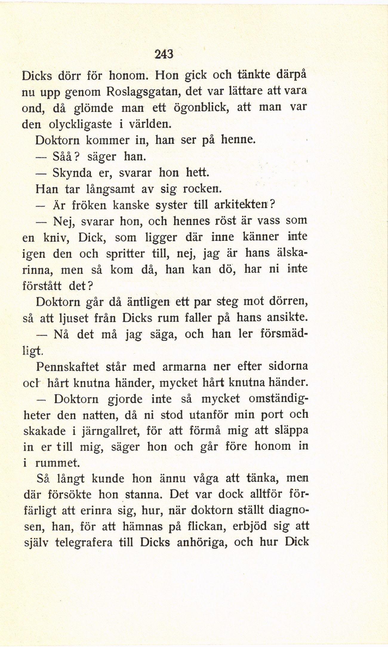 Doktorn går då äntligen ett par steg mot dörren,