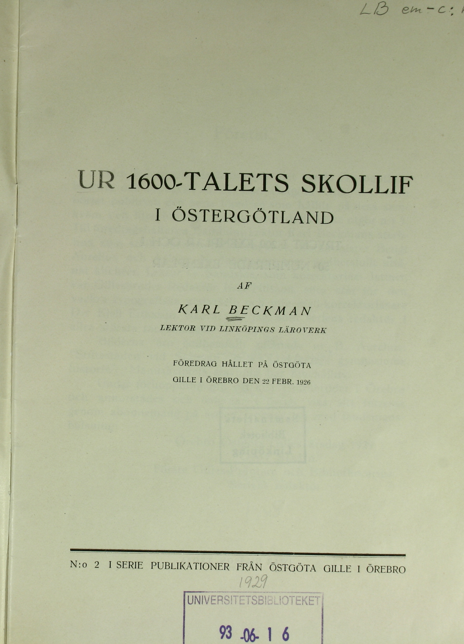 - Project Runeberg -  Ur 1600-talets skollif i Östergötland /