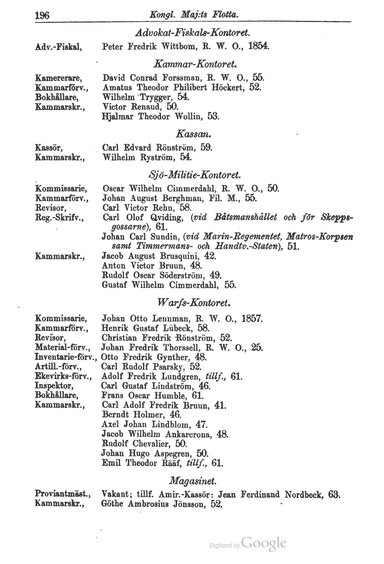 Kommissarie, Kammarförv., Revisor, Material-förv., Inventarie-forv., Artill.-förv., Ekevirks-förv., Inspektor, Bokhållare, Kammarskr., Warfs-Kontoret. Johan Otto Lennman, R. W. 0., 1857. Henrik Gustaf Liibeck, 58. Christian Fredrik Rönström, 52. Johan Fredrik Thorssell, R. W. 0., 25. Otto Fredrik Gynther, 48. Carl Rudolf Psarsky, 52. Adolf Fredrik Lundgren, tillf, 61. Carl Gustaf Lindström, 46. Frans Oscar Humble, 61. Carl Adolf Fredrik Bruun, 41. Berndt Holmer, 46. Axel Johan Lindblom, 47. Jacob Wilhelm Ankarcrona, 48. Rudolf Chevalier, 50. Johan Hugo Aspegren, 50. Emil Theodor Rääf, tillf, 61.