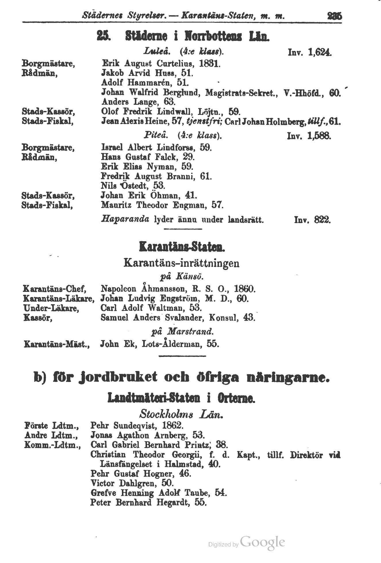 Full resolution (JPEG) - On this page / på denna sida - Svenska Kalendern - VI. Till Stats-Departementen hörande Stater och Korpser - 5) tillhörande K. Civil-Departementet - a) för den inre förvaltningen och politien - Städernes Styrelser, Werk och särskilde Tjenstemän - Karantäns-Staten - b) för jordbruket och öfriga näringarne - Landtmäteri-Staten i Orterne