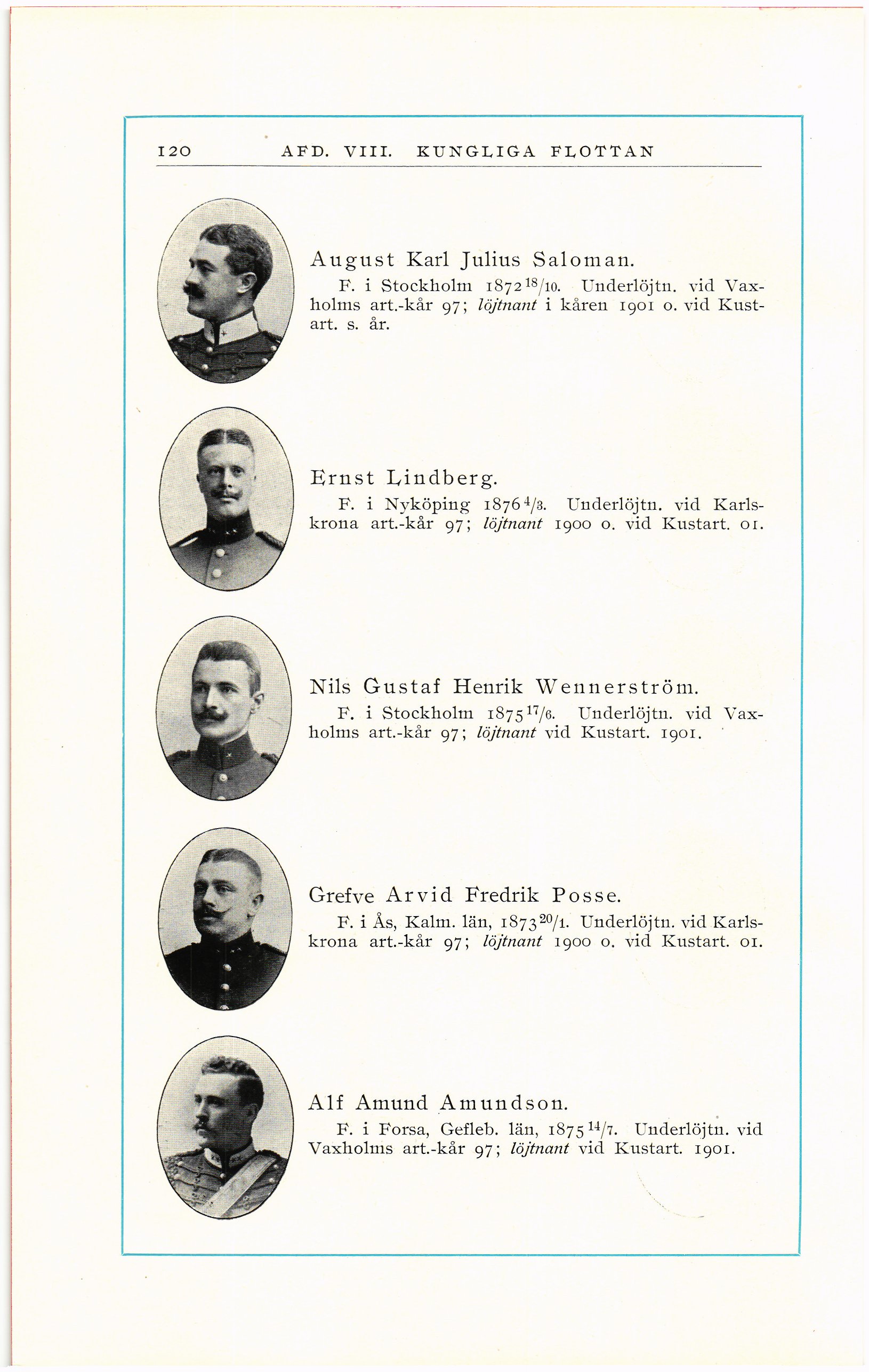 Karlskrona art.-kår 97; löjtnant 1900 o. vid Kustart. 01.