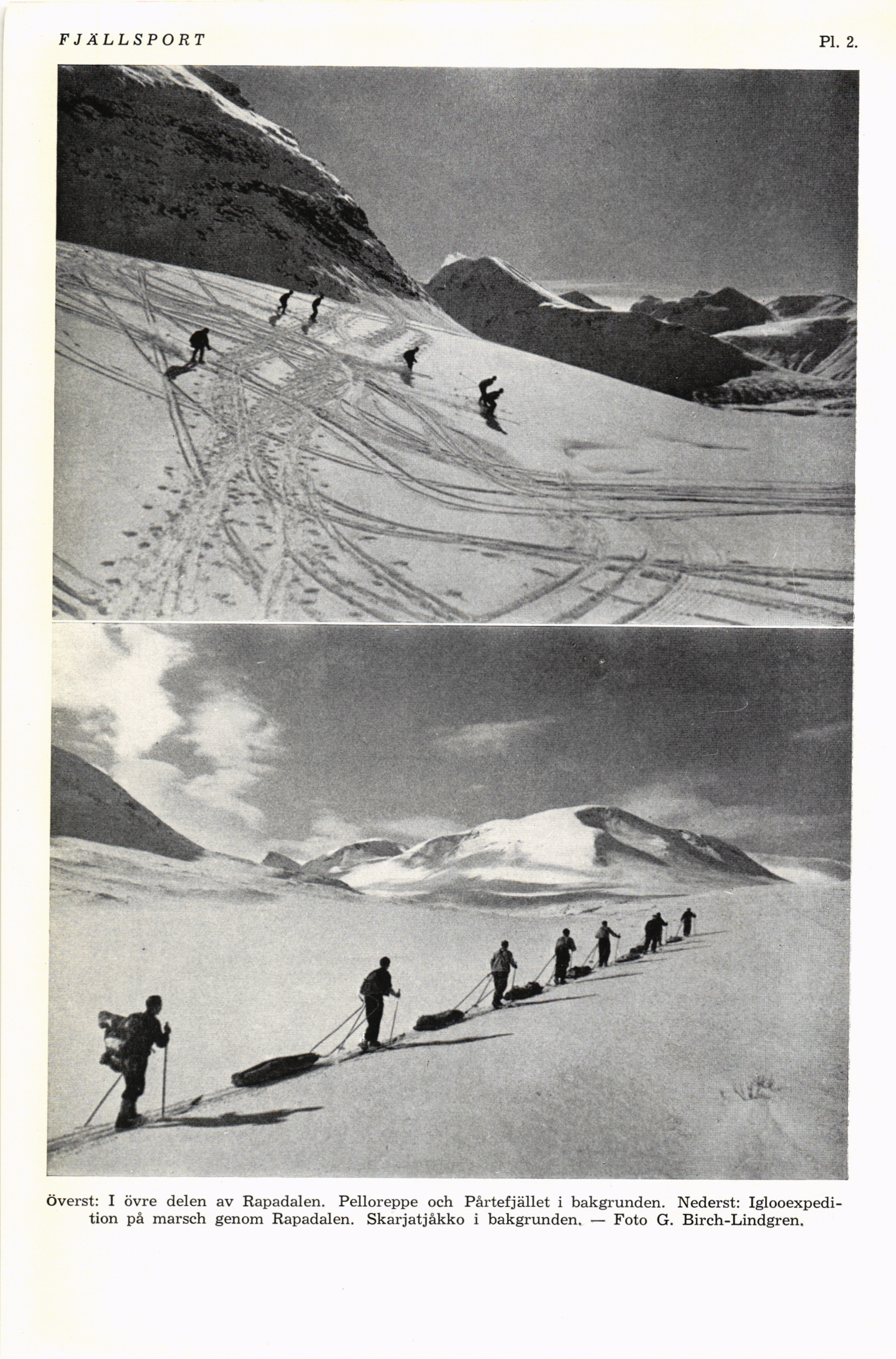 Iglooexpedi-tion på marsch genom Rapadalen. Skarjatjåkko i bakgrunden. — Foto G. Bireh-Lindgren.