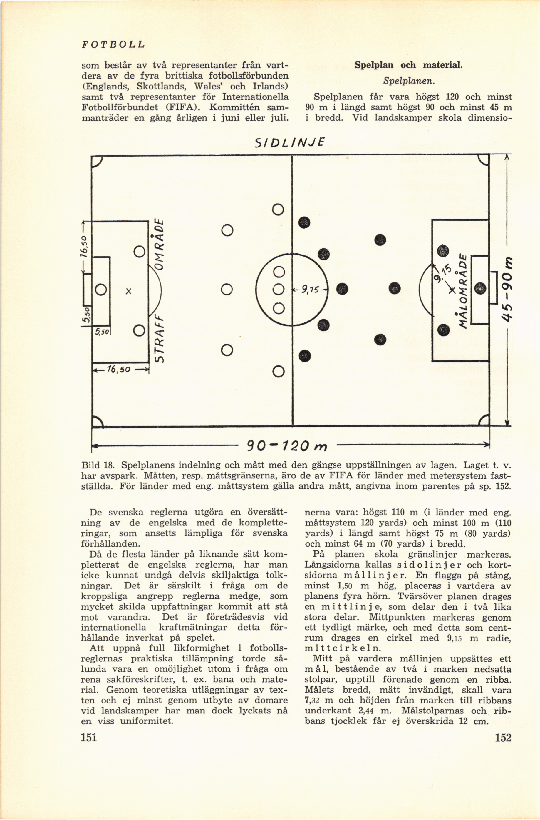 har avspark. Måtten, resp. måttsgränserna, äro de av FIFA för länder med metersystem