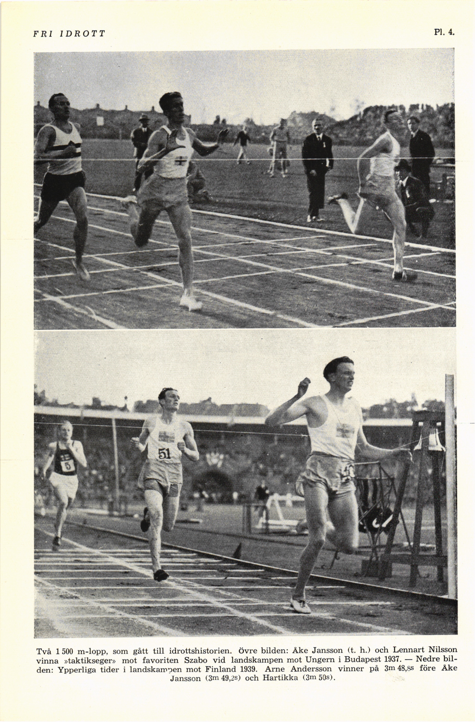 bilden: Ypperliga tider i landskampen mot Finland 1939. Arne Andersson vinner på 3m48,8s fore Åke