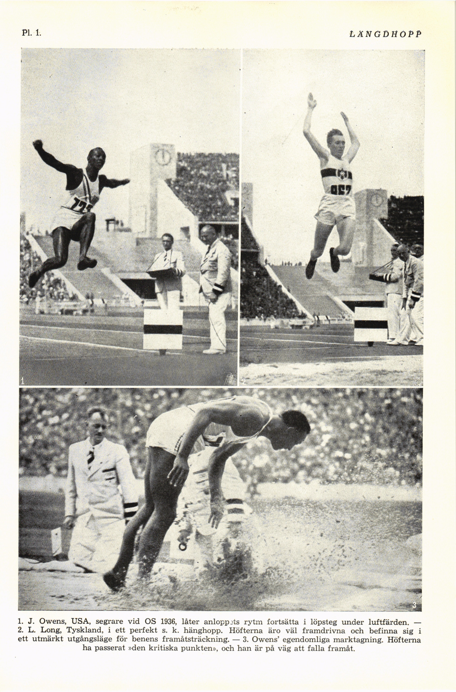 1. J. Owens, USA, segrare vid OS 1936, låter anloppjts rytm fortsätta i löpsteg under luftfärden. —