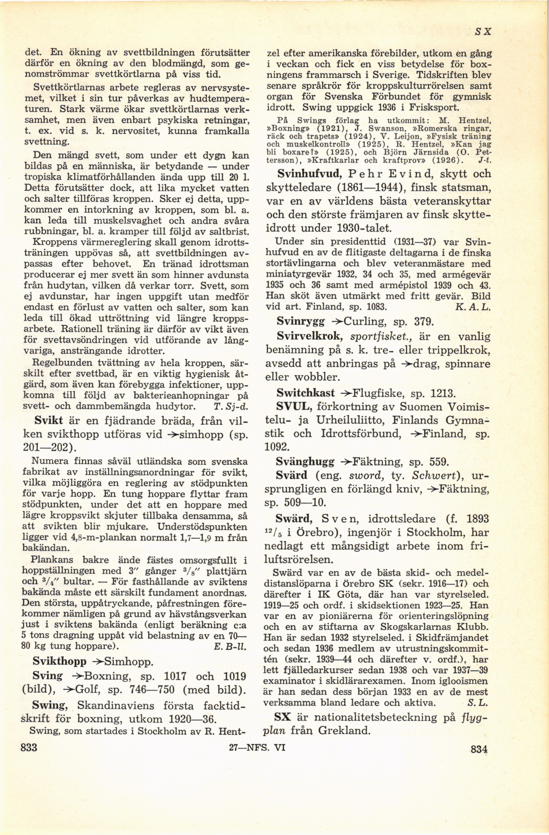 Full resolution (JPEG) - On this page / på denna sida - Svettning - Svikt - Svikthopp →Simhopp - Sving →Boxning, sp. 1017 och 1019 (bild), →Golf, sp. 746-750 (med bild) - Swing - Svinhufvud, Pehr Evind - Svinrygg →Curling, sp. 379 - Svirvelkrok - Switchkast →Flugfiske, sp. 1213 - SVUL, förkortning av Suomen Voimistelu- ja Urheiluliitto, Finlands Gymnastik och Idrottsförbund, →Finland, sp. 1092 - Svänghugg →Fäktning, sp. 559 - Svärd - Swärd, Sven - SX