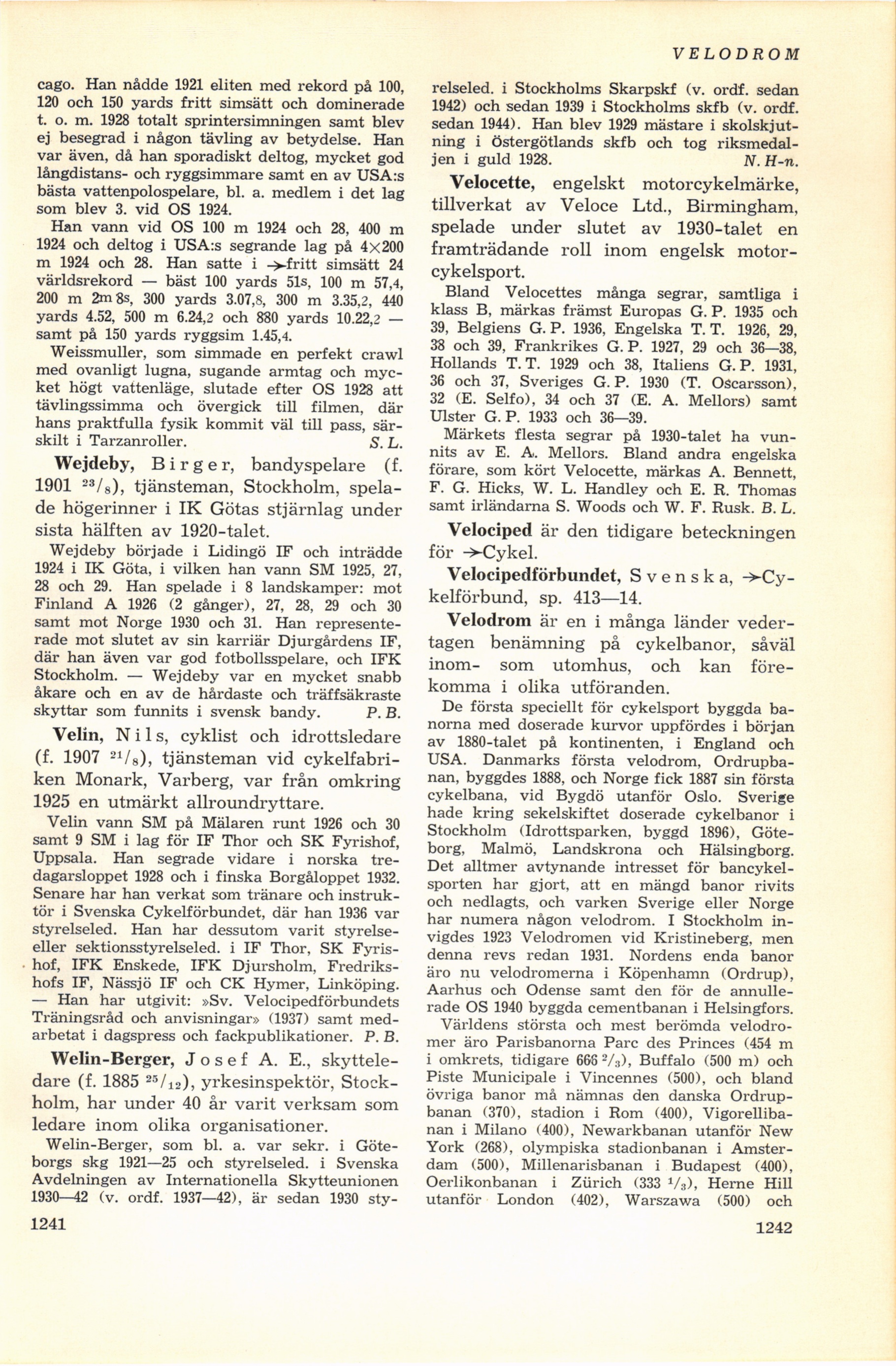 Full resolution (JPEG) - On this page / på denna sida - Weissmuller, John - Vejdeby, Birger - Velin, Nils - Welin-Berger, Josef A. E. - Velocette - Velociped är den tidigare beteckningen för →Cykel - Velocipedförbundet, Svenska →Cykelförbund, sp. 413-14 - Velodrom