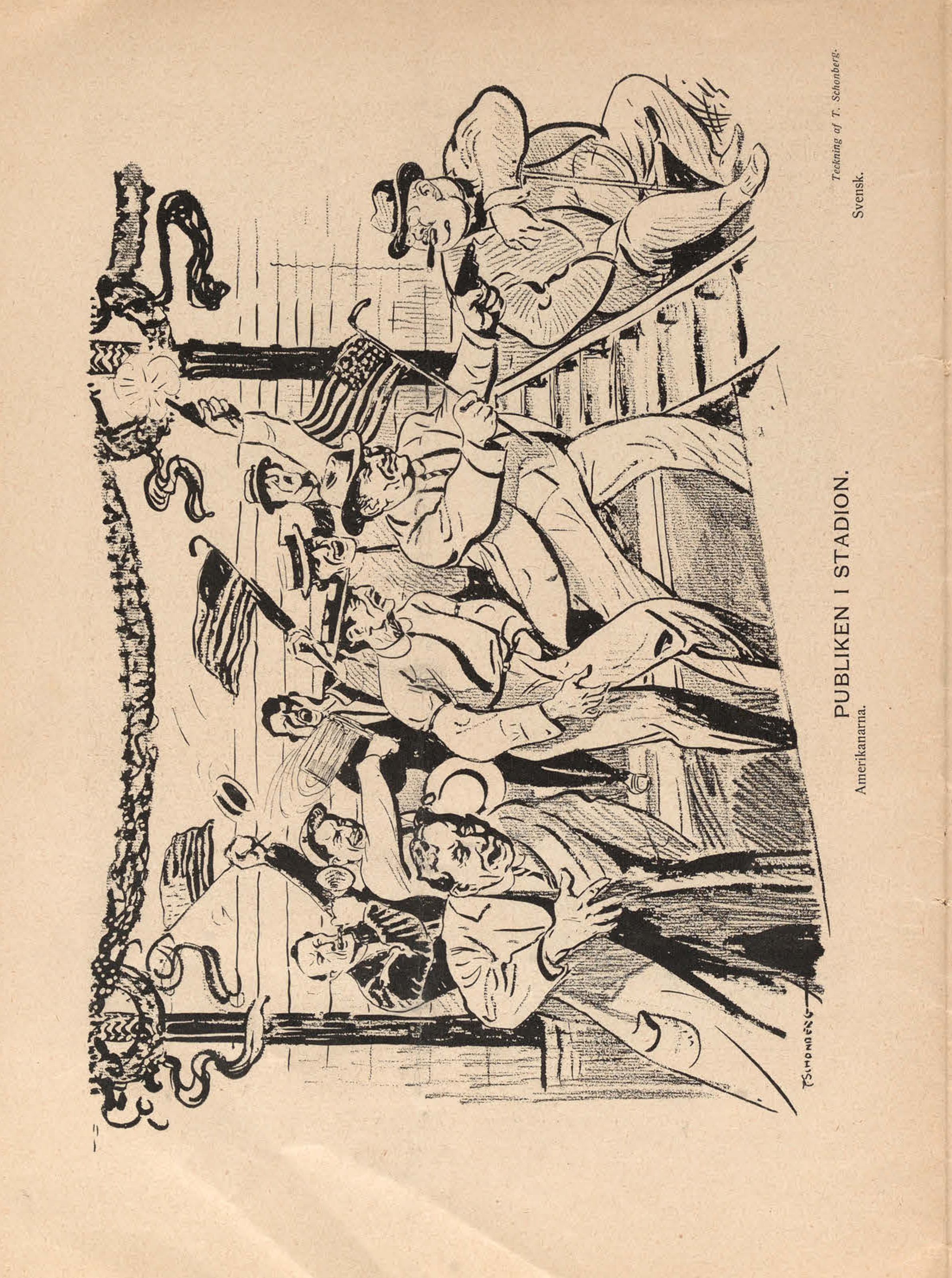 PUBLIKEN I STADION. Teckning af T. Schonberg. Amerikanarna. Svensk. |