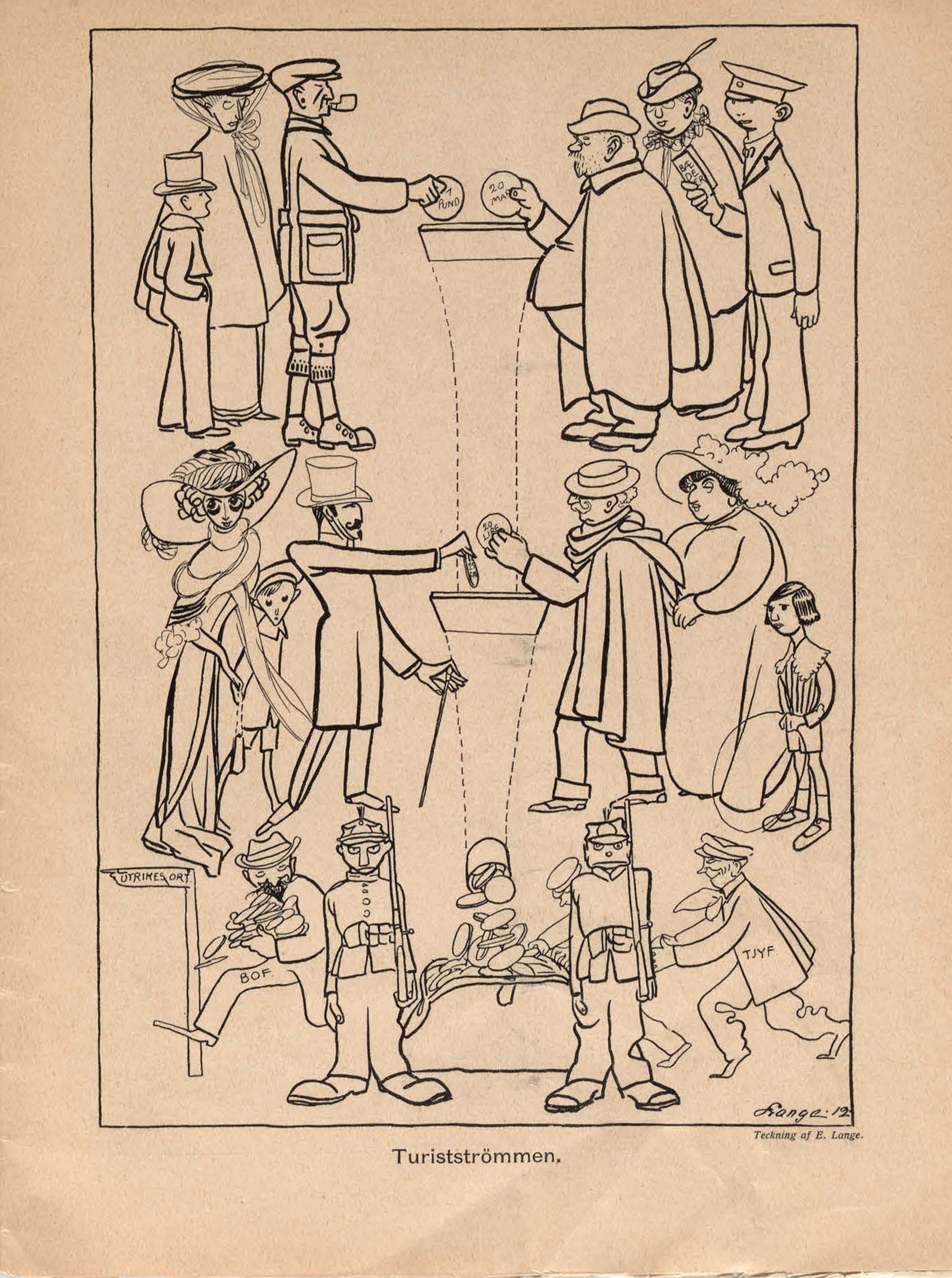UTRIKESORT BOF TJYF Ill. Lange -12. Turistströmmen. Teckning af E. Lange. |