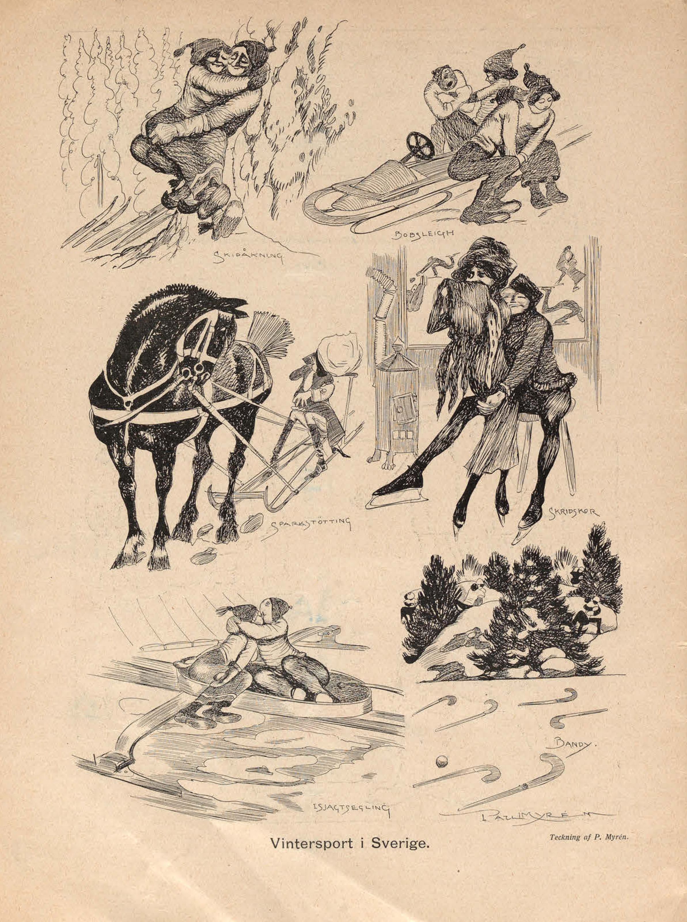 SKIDÅKNING BOBSLEIGH SPARKSTÖTTING SKRIDSKOR ISJAGTSEGLING BANDY Ill. PAUL MYRÉN Vintersport i Sverige. Teckning af P. Myrén. |