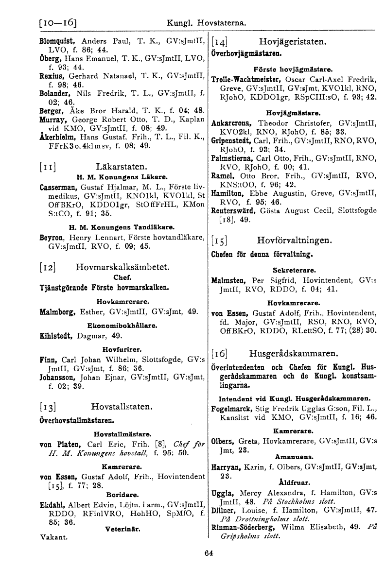 Full resolution (TIFF) - On this page / på denna sida - [7] Kungl. Hovstaterna - [10] Kleresistaten - [11] Läkarstaten - [12] Hovmarksalksämbetet - [13] Hovstallstaten - [14] Hovjägeristaten - [15] Hovförvaltningen - [16] Husgerådskammaren