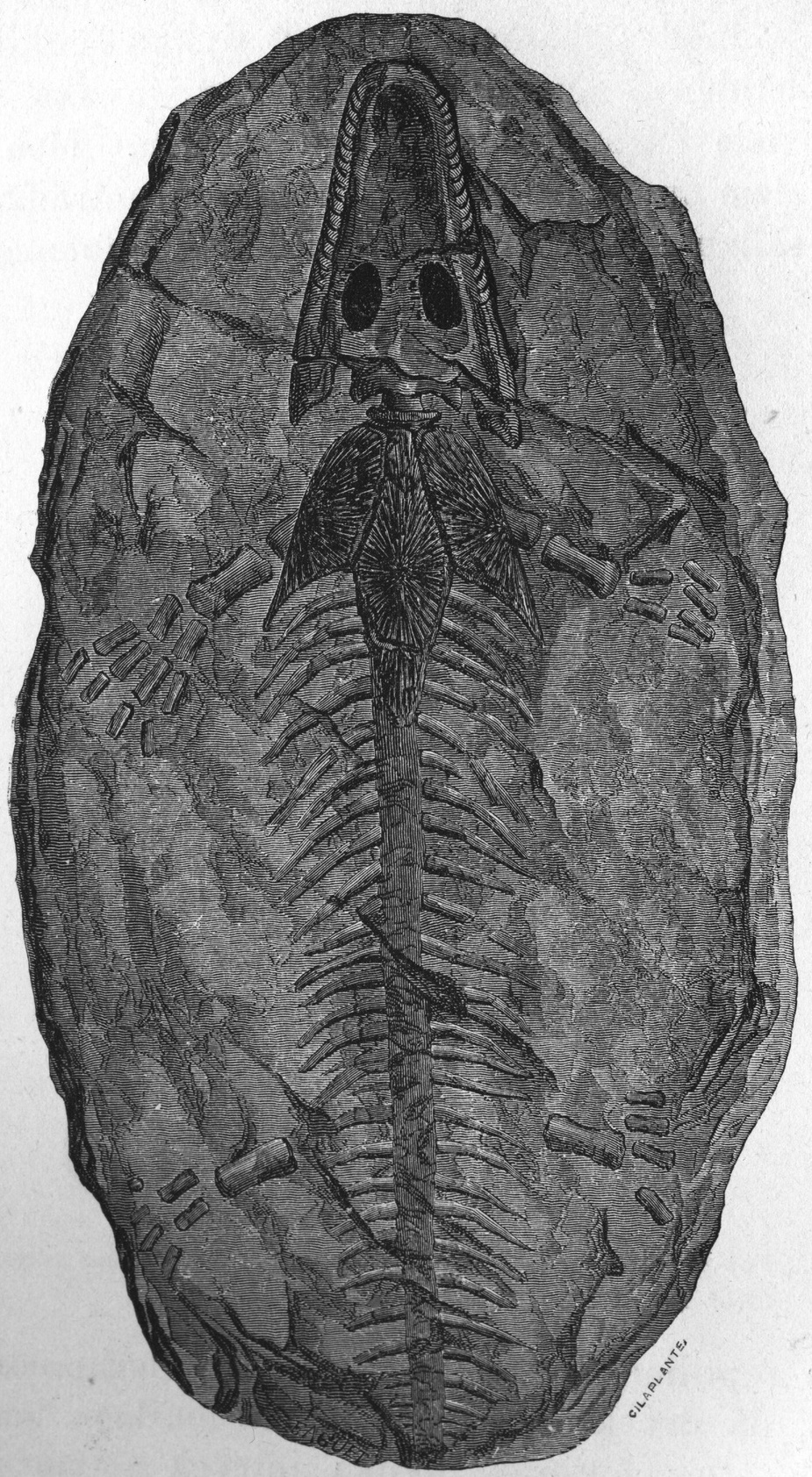 | Ill. A. FAGUET. Bild 9. Skelett af Archegosaurus Decheni från kolformationen vid Saarbrucken. |