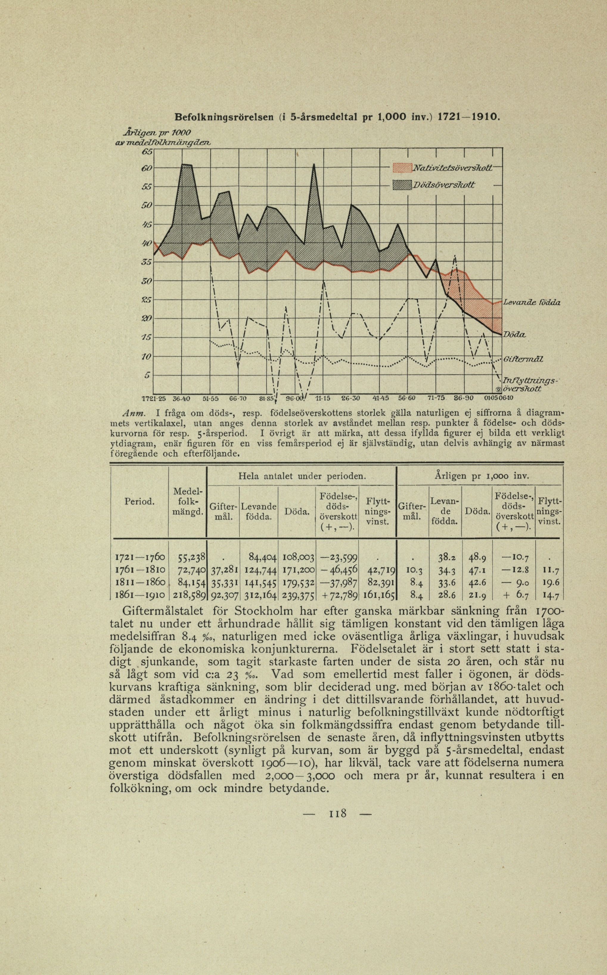 Befolkningsrörelsen (i 5-årsmedeltal pr 1,000 inv.) 1721—1910.