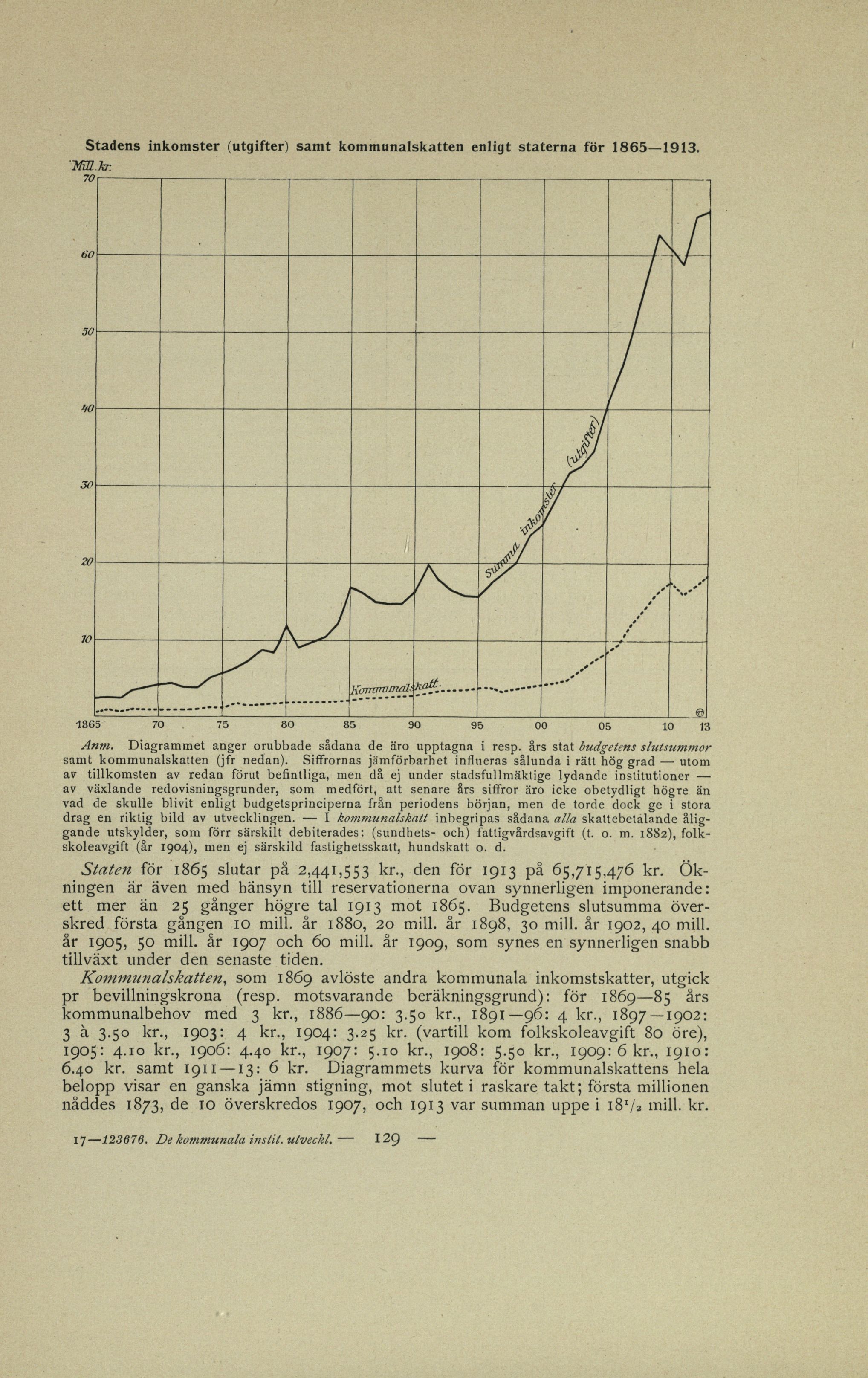 Stadens inkomster (utgifter) samt kommunalskatten enligt staterna för 1865—1913.