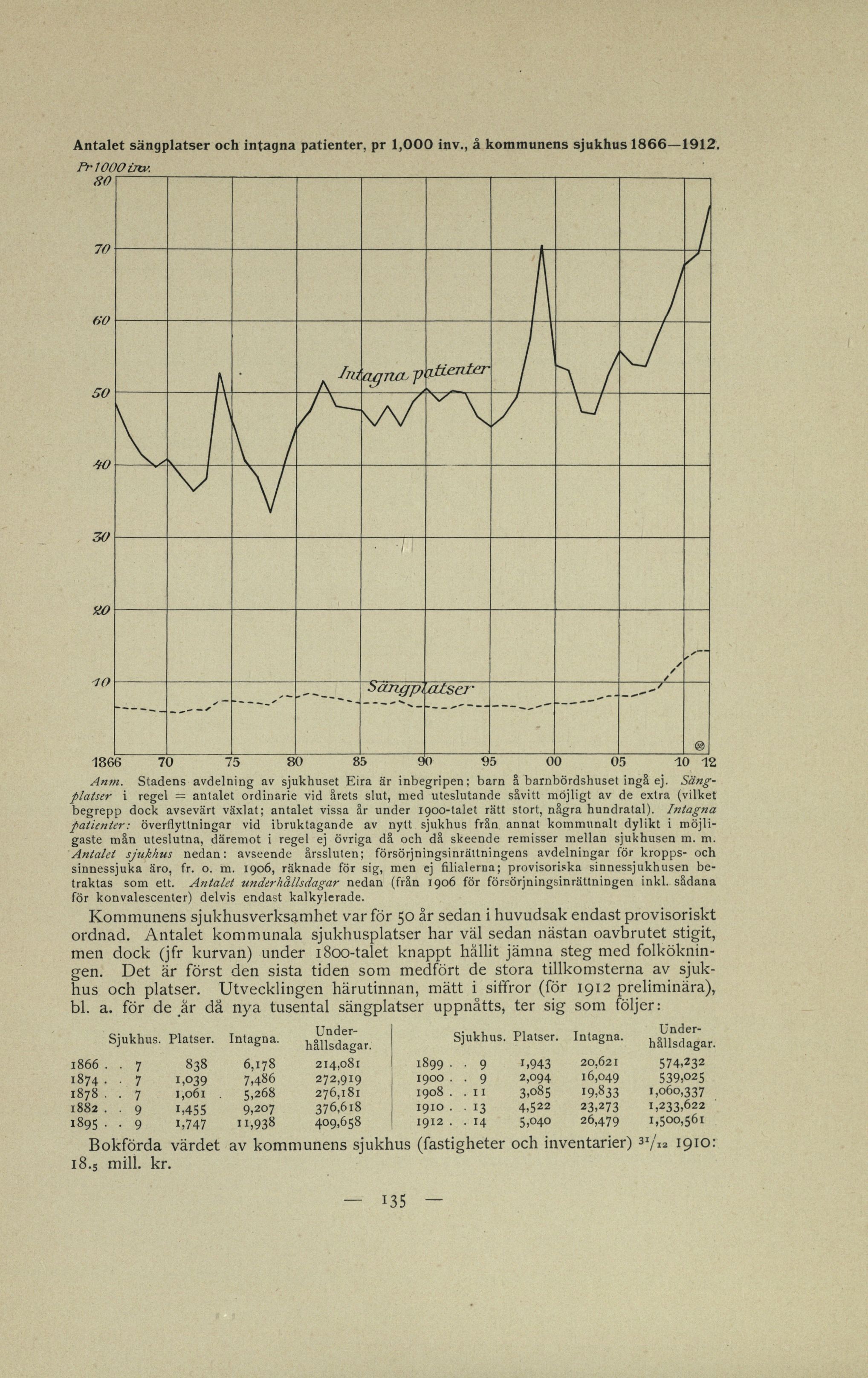 Antalet sängplatser och intagna patienter, pr 1,000 inv., å kommunens sjukhus 1866—1912.