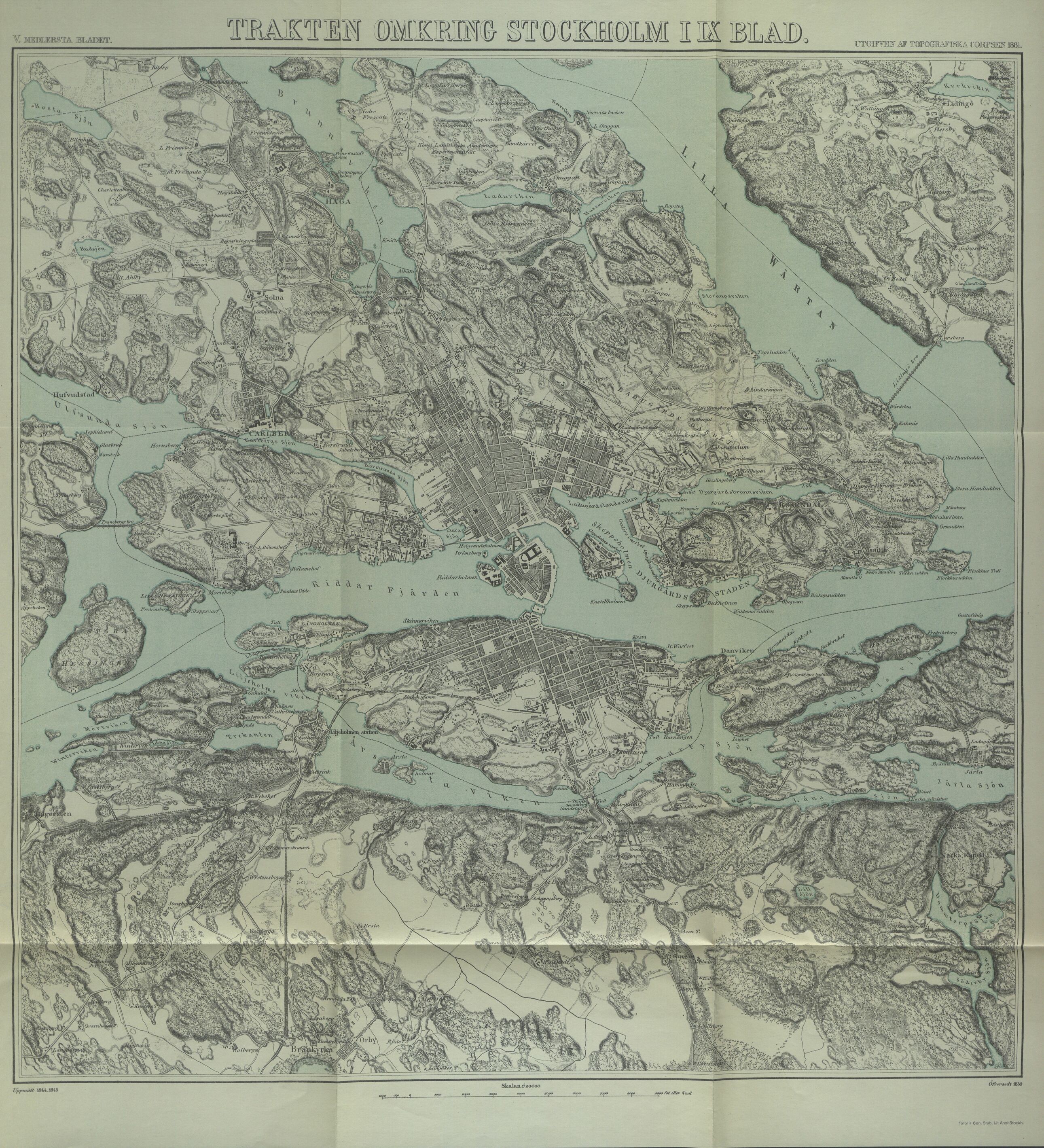 Full resolution (JPEG) - On this page / på denna sida - Kartbilagor - Trakten omkring Stockholm i 9 blad utgiven av topografiska kåren 1861, blad 5 (mellersta bladet)