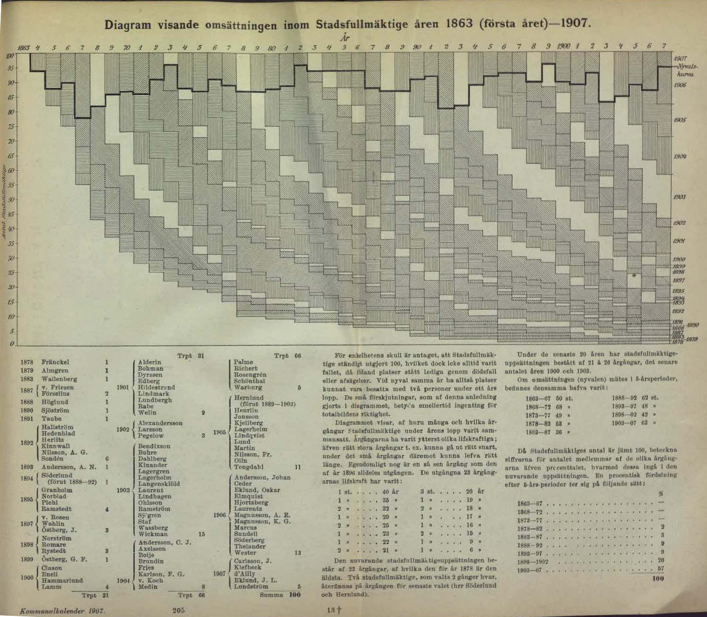 Diagram visande omsättningen inom Stadsfullmäktige åren 1863 (första året)—1907.