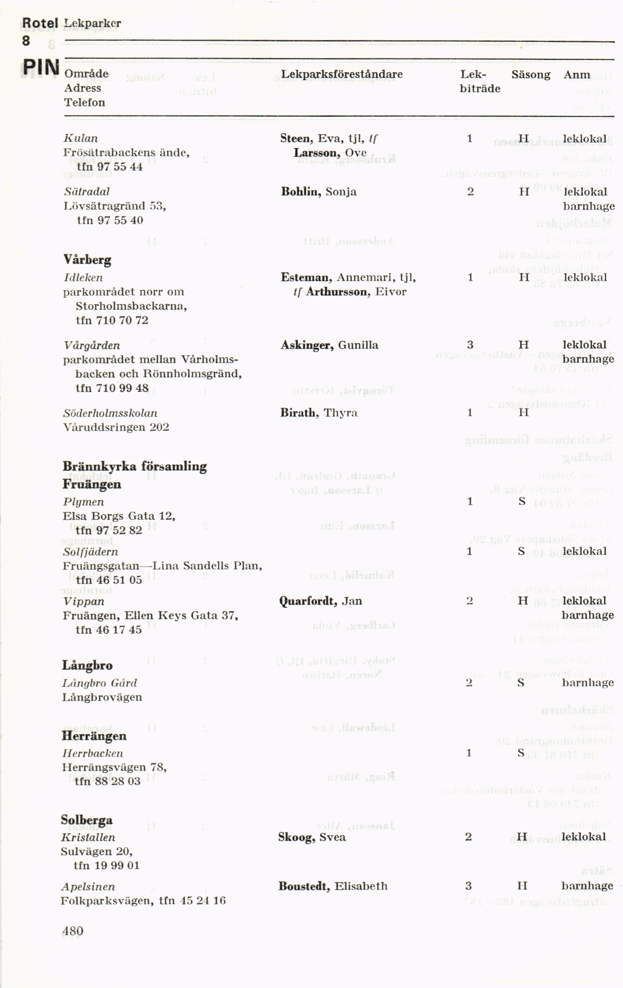 Område Adress Telefon Lekparksföreståndare [-Lekbiträde-] {+Lek- biträde+} Säsong Anm