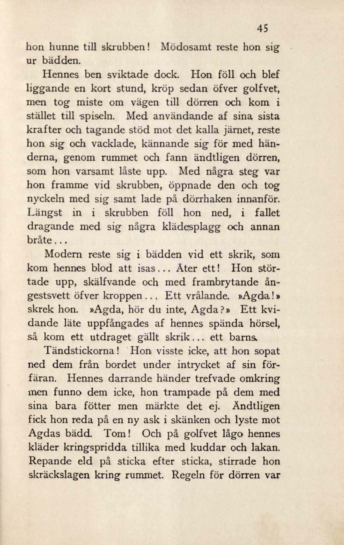 gestsvett öfver kroppen ... Ett vrålande. »Agda !»