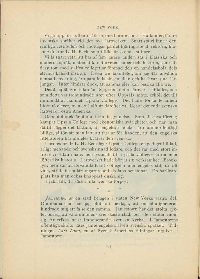 I professor dr L. H. Beck äger Upsala College en gediget bildad,