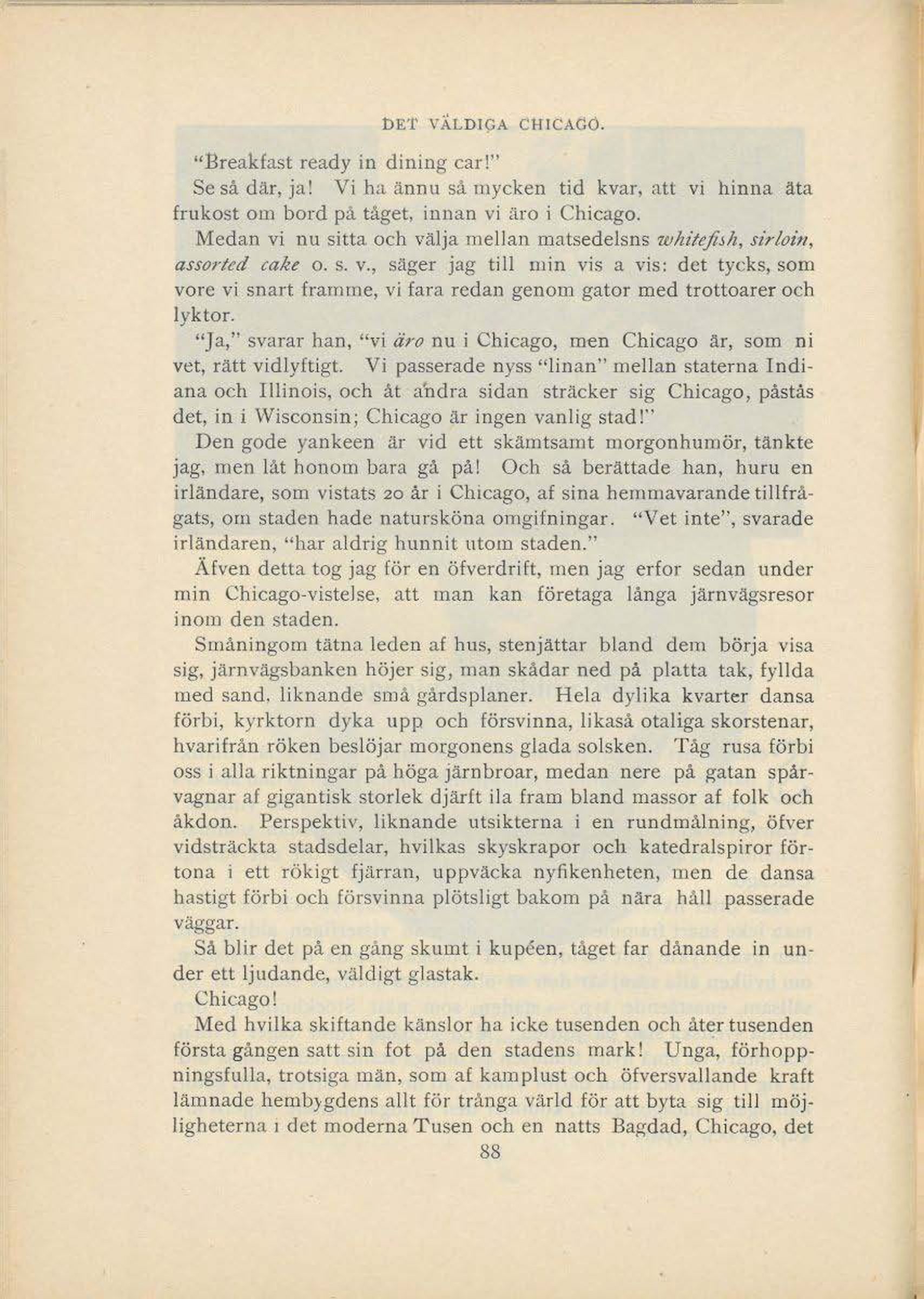 "Ja," svarar han, "vi äro nu i Chicago, men Chicago är, som ni