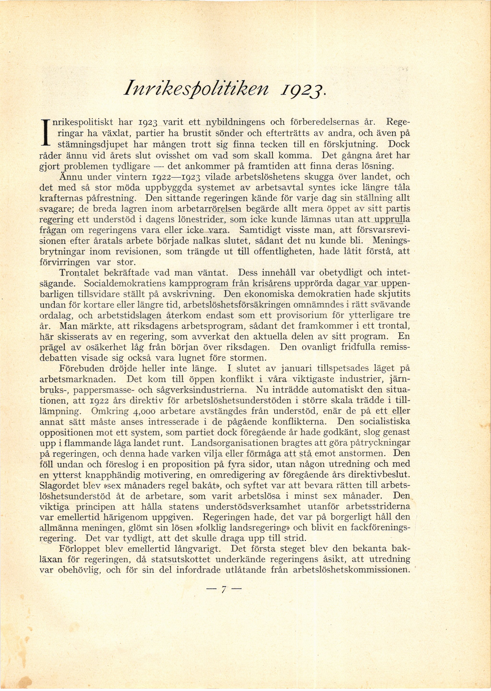 Ännu under vintern 1922—^1923 vilade arbetslöshetens skugga över landet, och