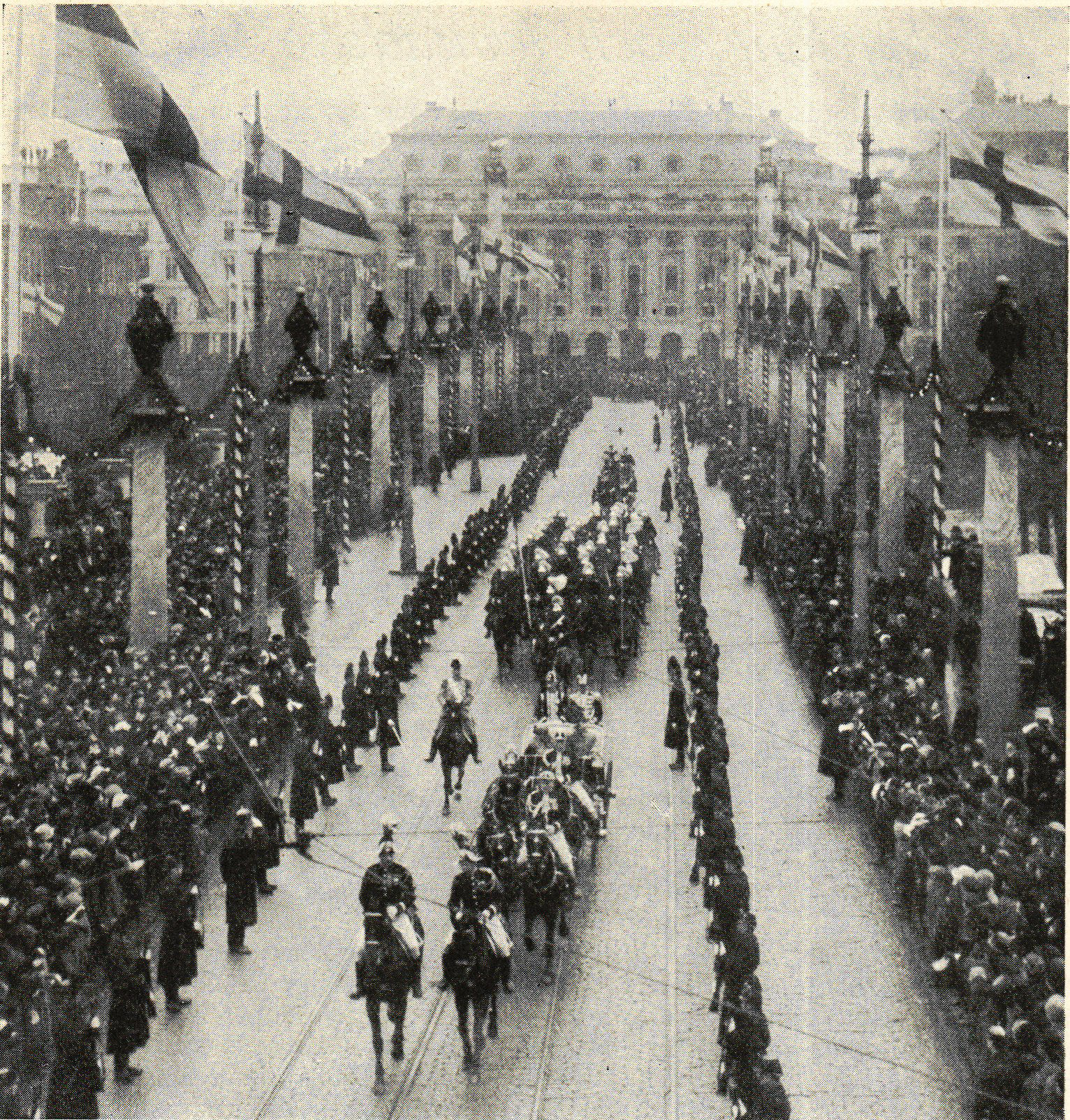 Från kronprinsparets ankomst till Stockholm. Kortégen passerar den med flaggor och kolonner smyckade Norrbro. |