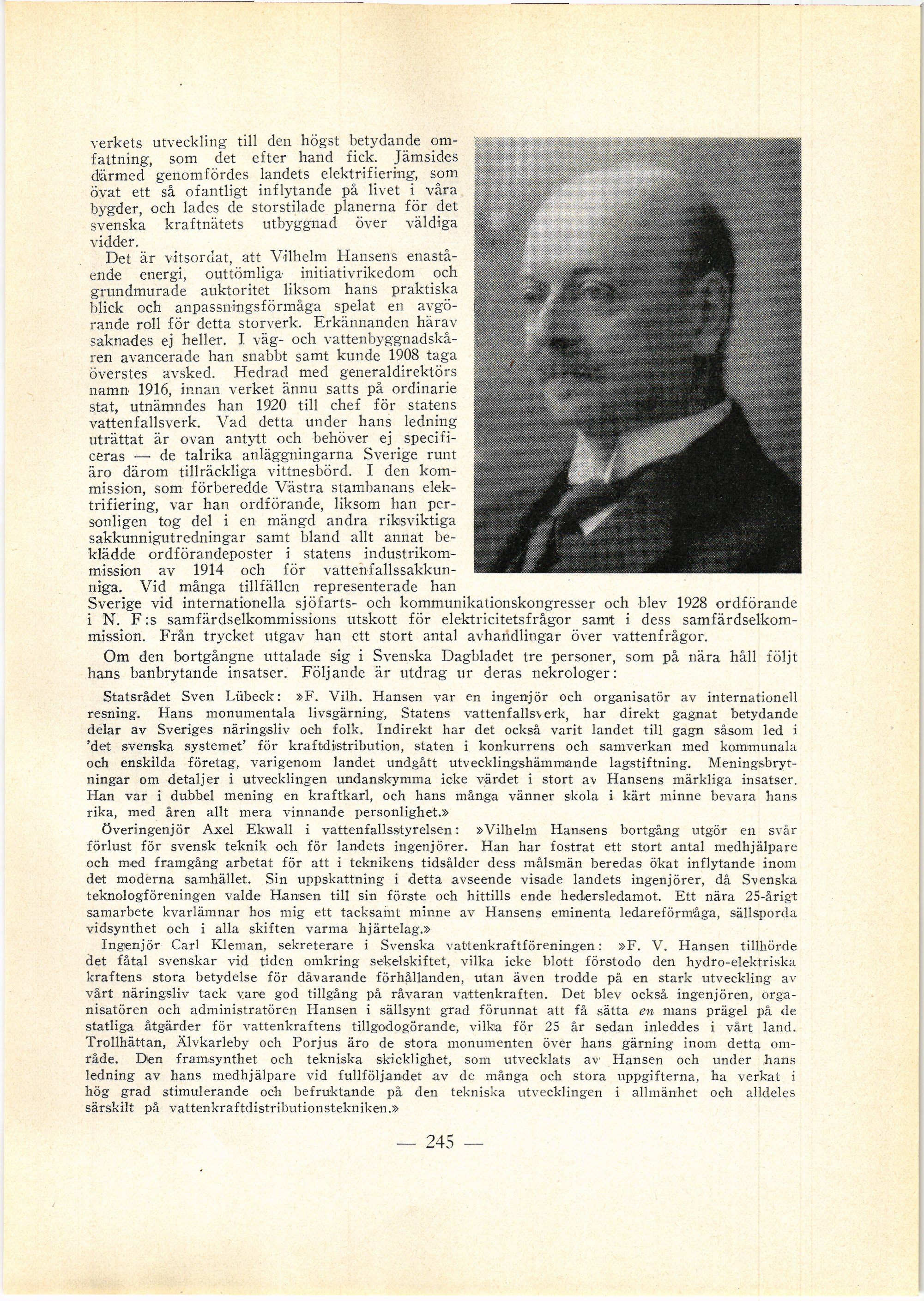 Ingenjör Carl Kleman, sekreterare i Svenska vattenkraftföreningen: »F. V. Hansen tillhörde