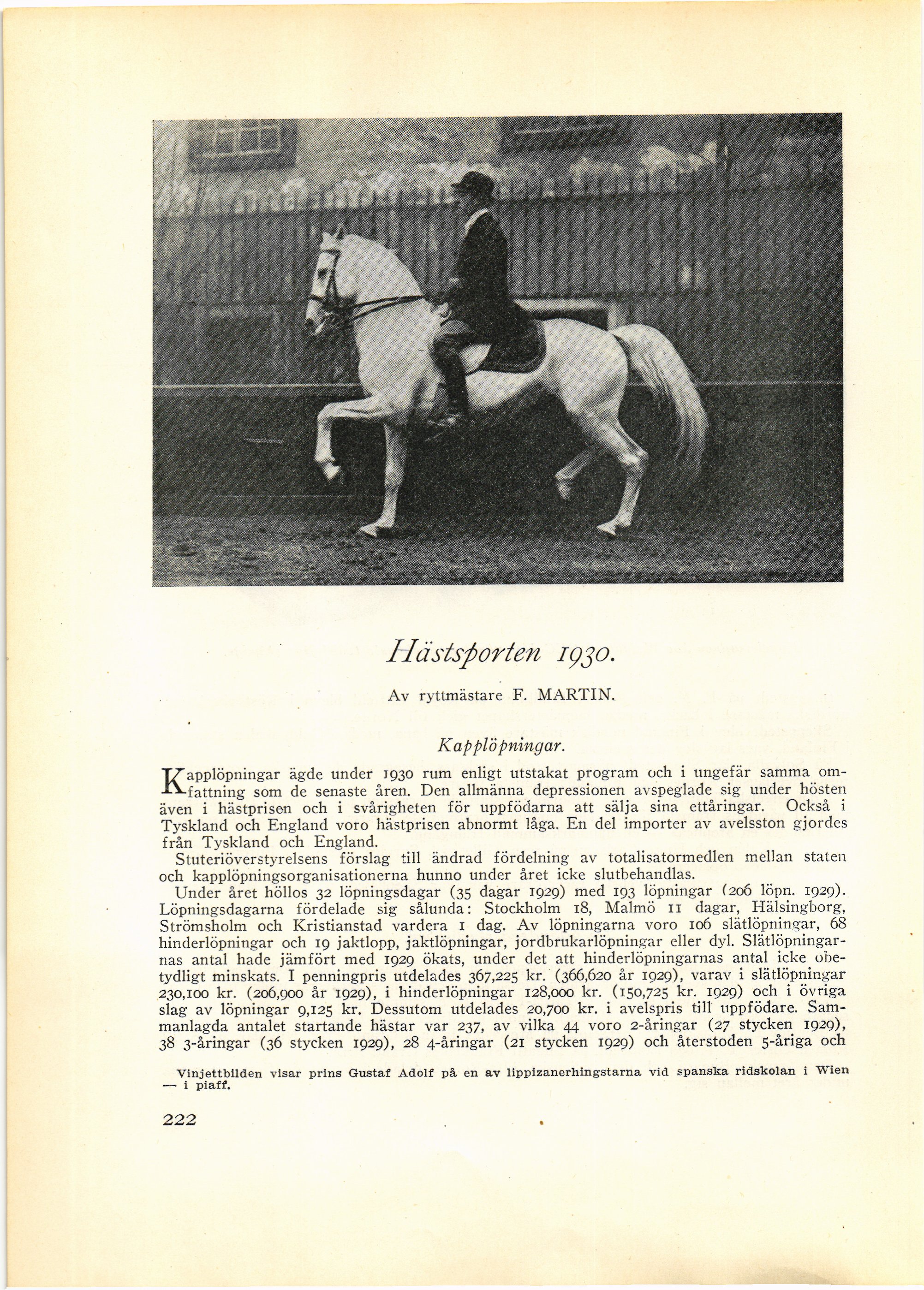 Vinjettbilden visar prins Gustaf Adolf på en av lippizanerhingstarna vid spanska ridskolan i Wien