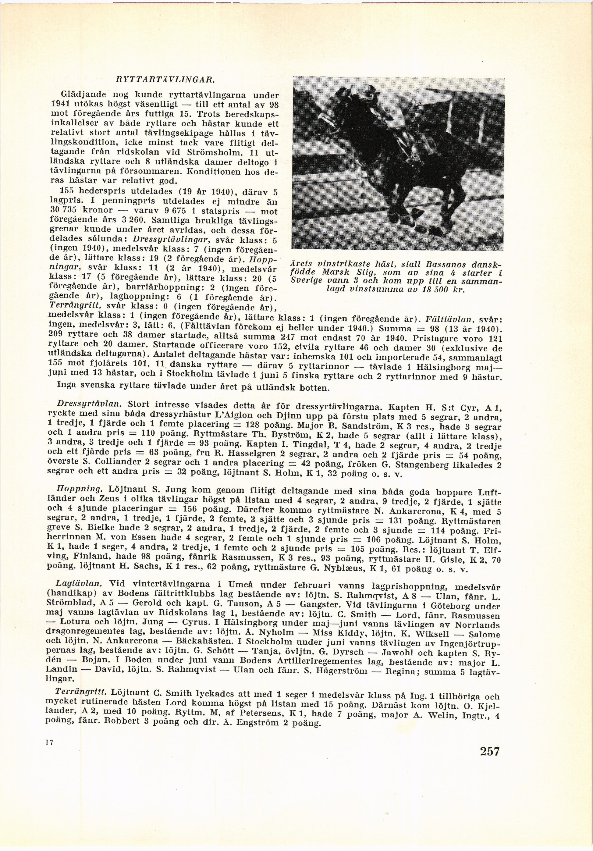 209 ryttare och 38 damer startade, alltså summa 247 mot endast 70 år 1940. Pristagare voro 121