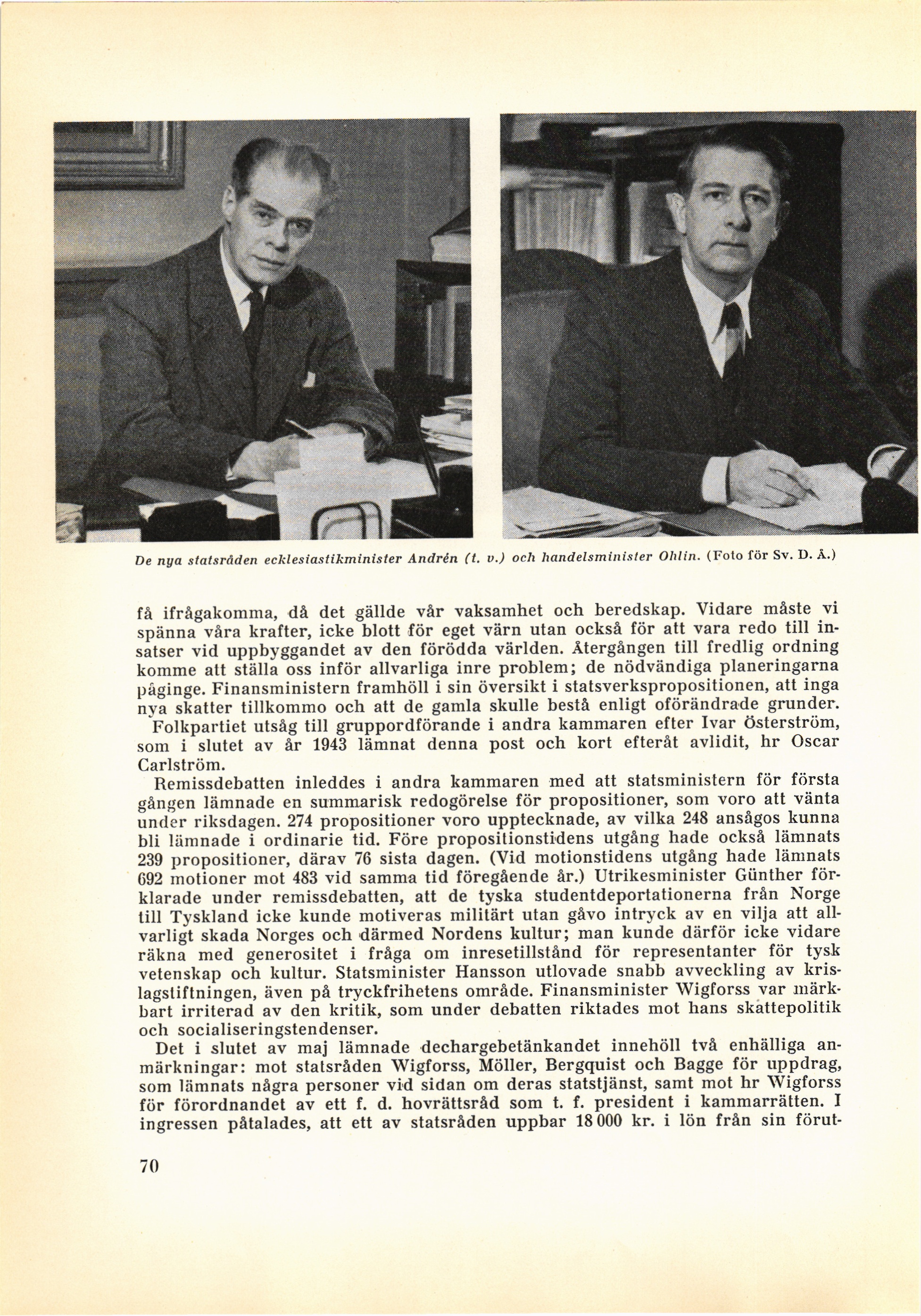 De nya statsråden ecklesiastikminister Andrén (t. v.) och handelsminister Ohlin. (Foto för Sv. D. A.)
