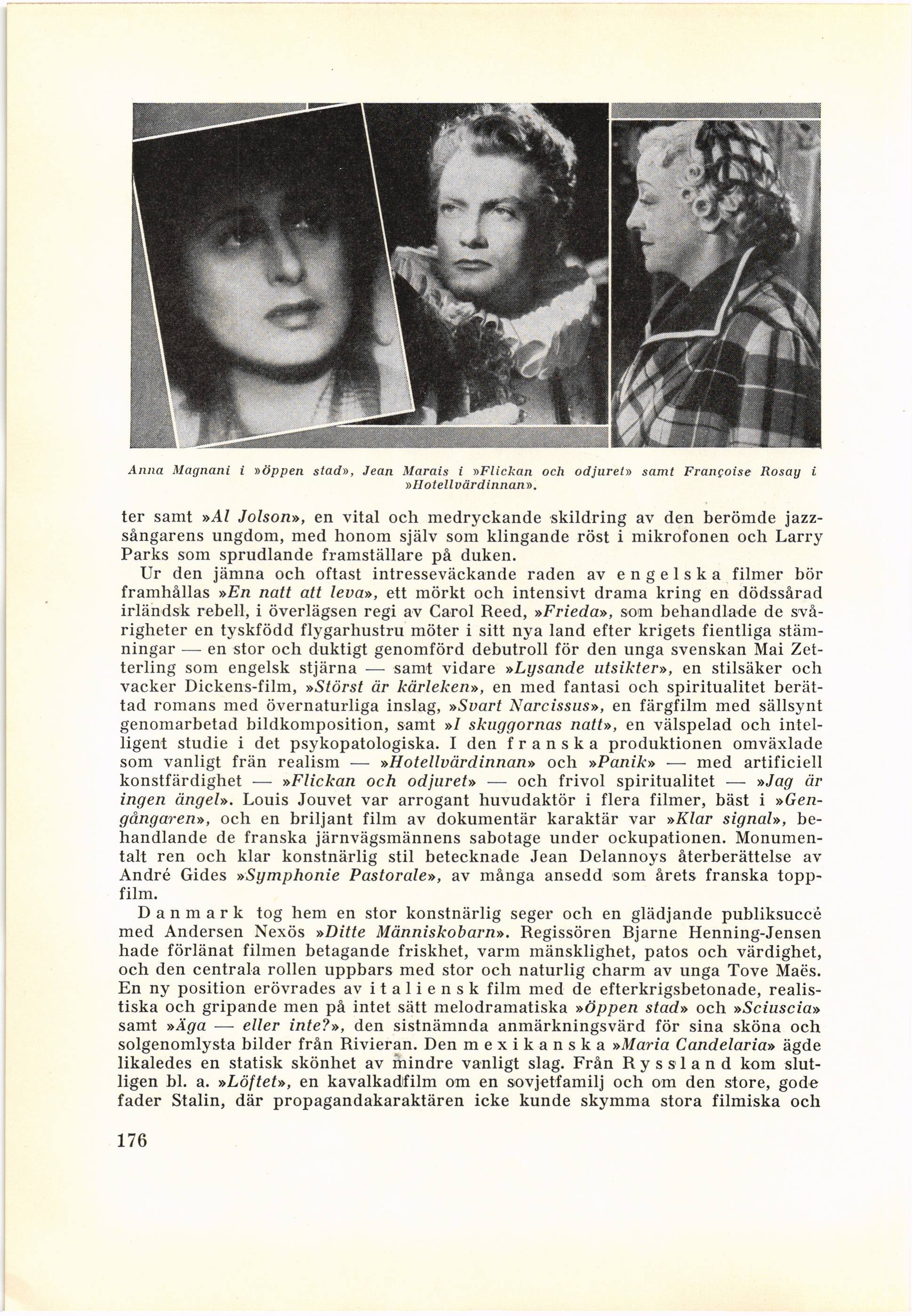 Anna Magnani i »öppen stad», Jean Marais i »Flickan och odjuret» samt Franfoise Rosay i