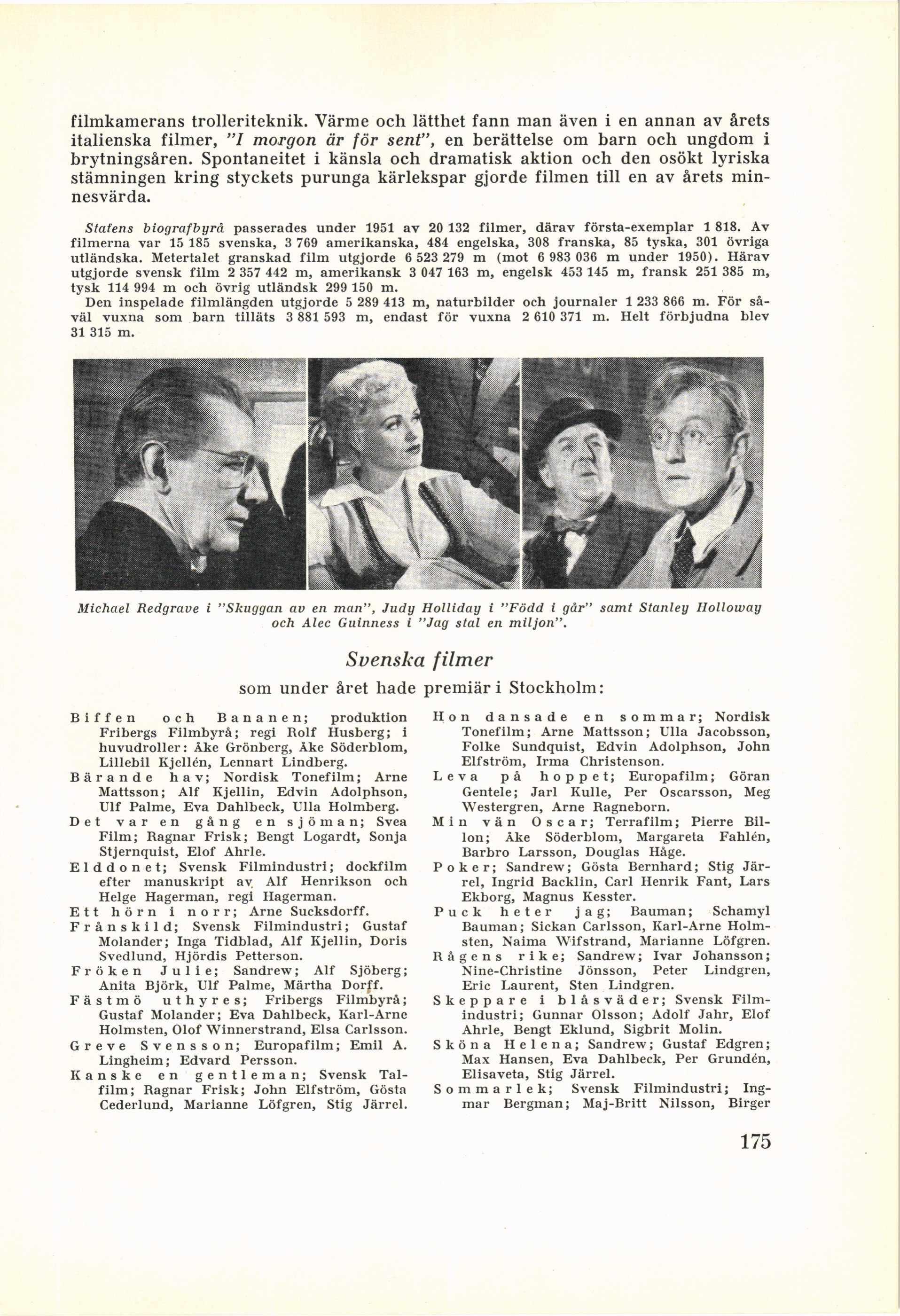 Statens biografbyrå passerades under 1951 av 20 132 filmer, därav första-exemplar 1 818. Av
