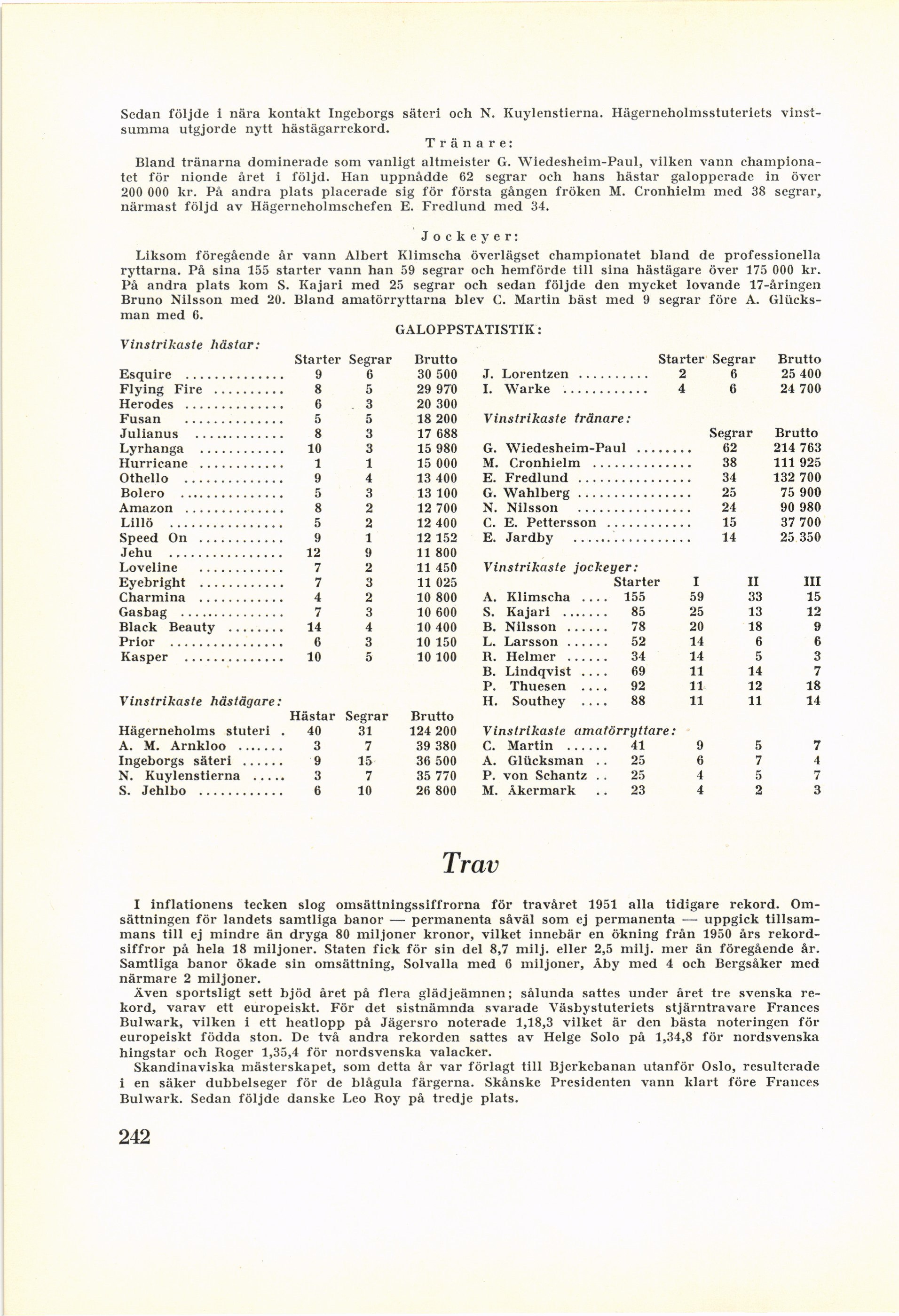ryttarna. På sina 155 starter vann han 59 segrar och hemförde till sina hästägare över 175 000 kr.