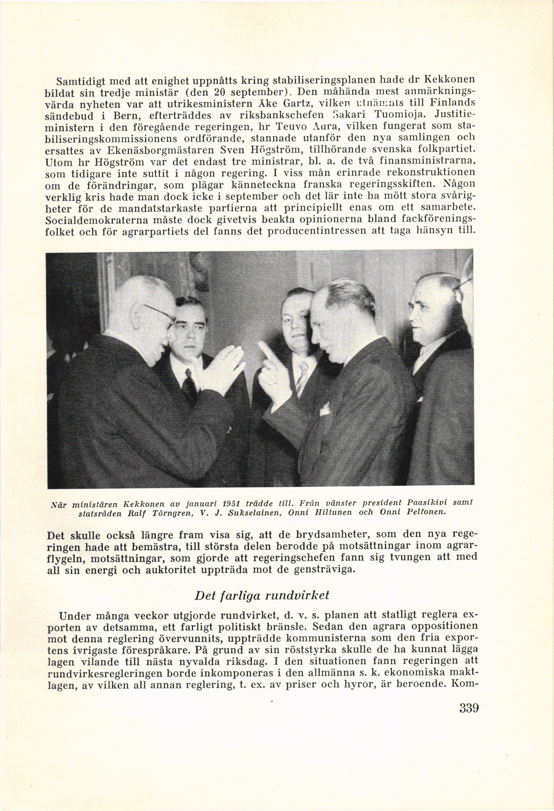 När ministären Kekkonen av januari 1951 trädde till. Från vänster president Paasikivi samt