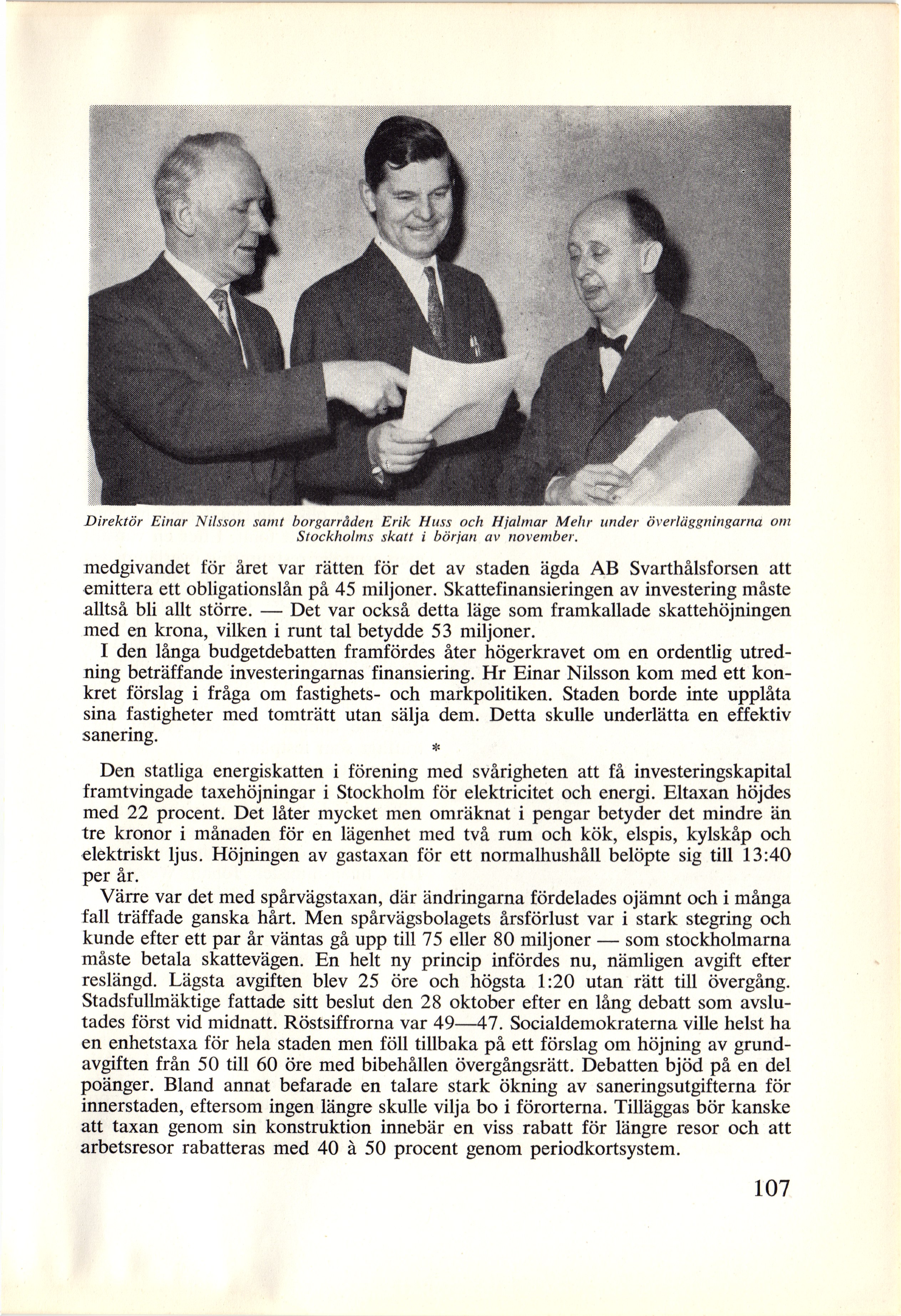 Direktör Einar Nilsson samt borgarråden Erik Huss och Hjalmar Mehr under överläggningarna om
