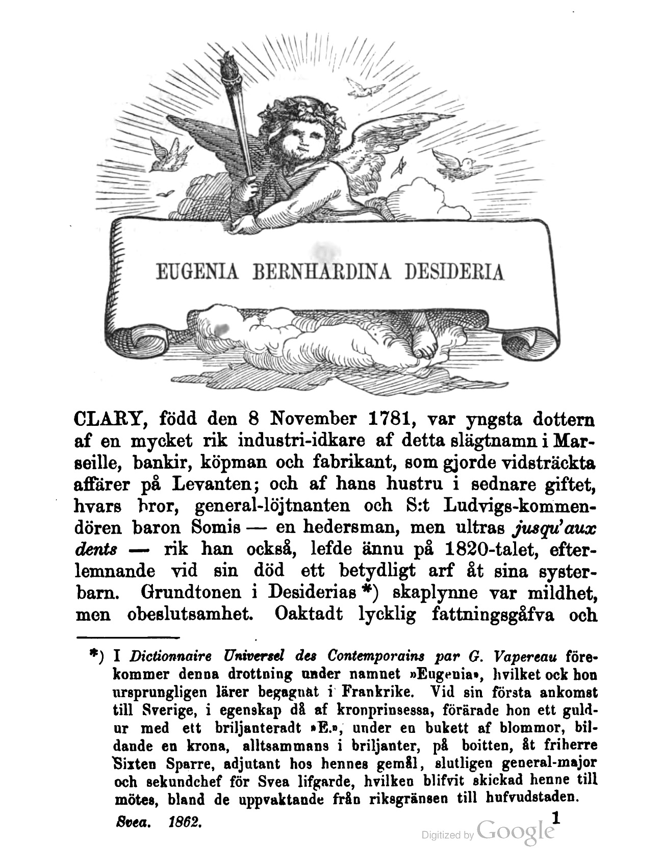 - Eugenia Bernhardina Desideria. Lefnadsteckning af M. J. Crusenstolpe (med lithogr. porträtt af Drottning Desideria)
