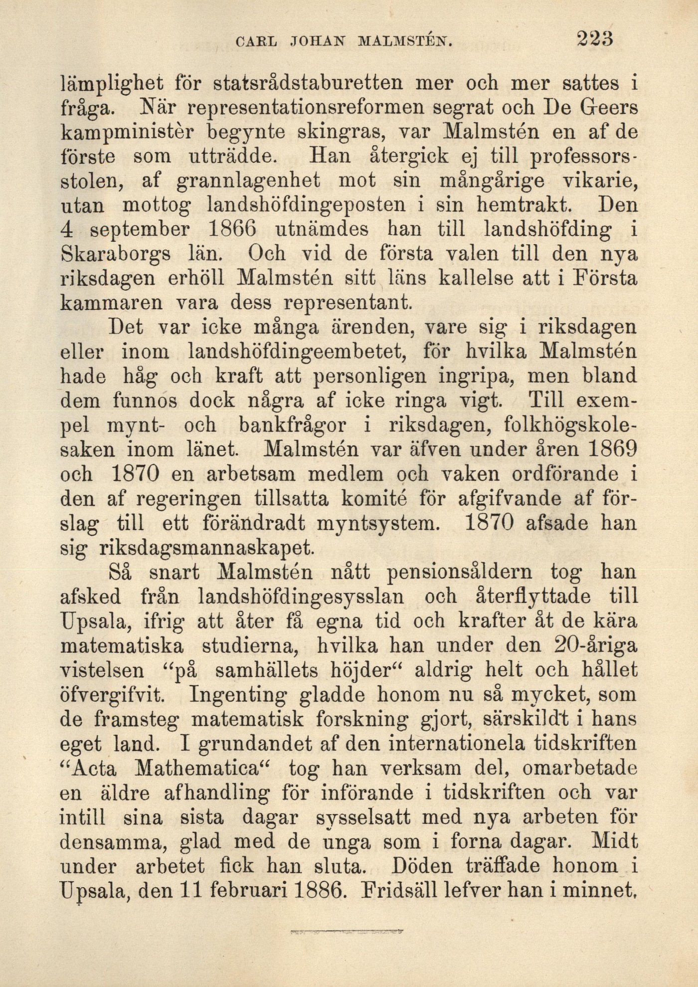 Upsala, den 11 februari 1886. Fridsäll lefver han i minnet.