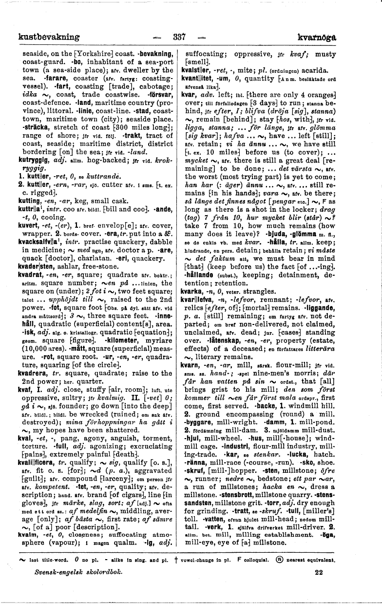 kvarn, -en, -ar, mill, särsk. flour-mill; jfr vid.