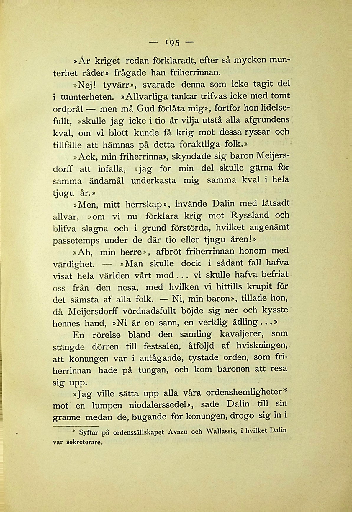 * Syftar pä ordenssällskapet Avazu och Wa]Iassis, i hvilket Dalin