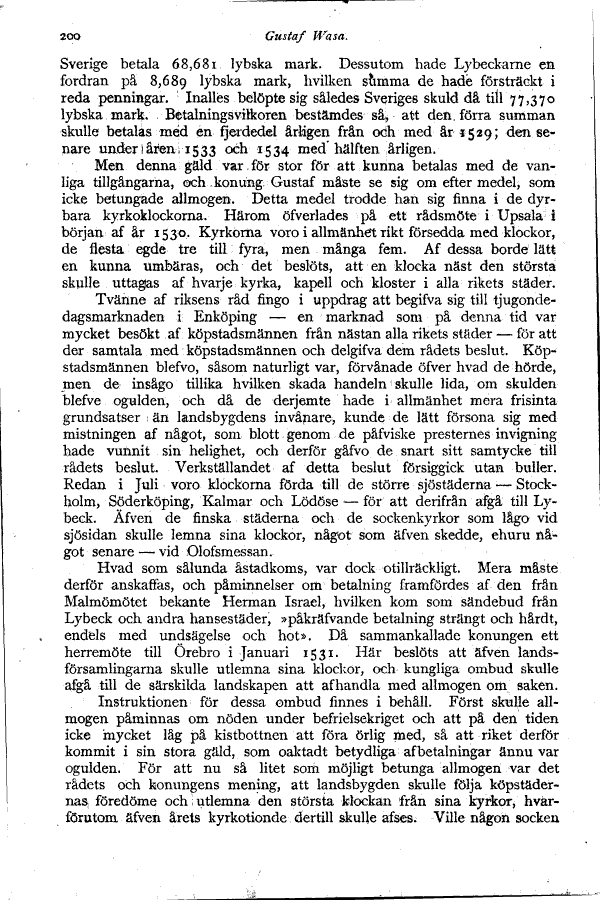 Men denna gäld var för stor för att kunna betalas med de vanliga tillgångarna, och konung Gustaf måste se sig om efter medel, som icke betungade allmogen. Detta medel trodde han sig finna i de dyrbara kyrkoklockorna. Härom öfverlades på ett rådsmöte i Upsala i början af år 1530. Kyrkorna voro i allmänhet rikt försedda med klockor, de flesta egde tre till fyra, men många fem. Af dessa borde lätt en kunna umbäras, och det beslöts, att en klocka näst den största skulle uttagas af hvarje kyrka, kapell och kloster i alla rikets städer.