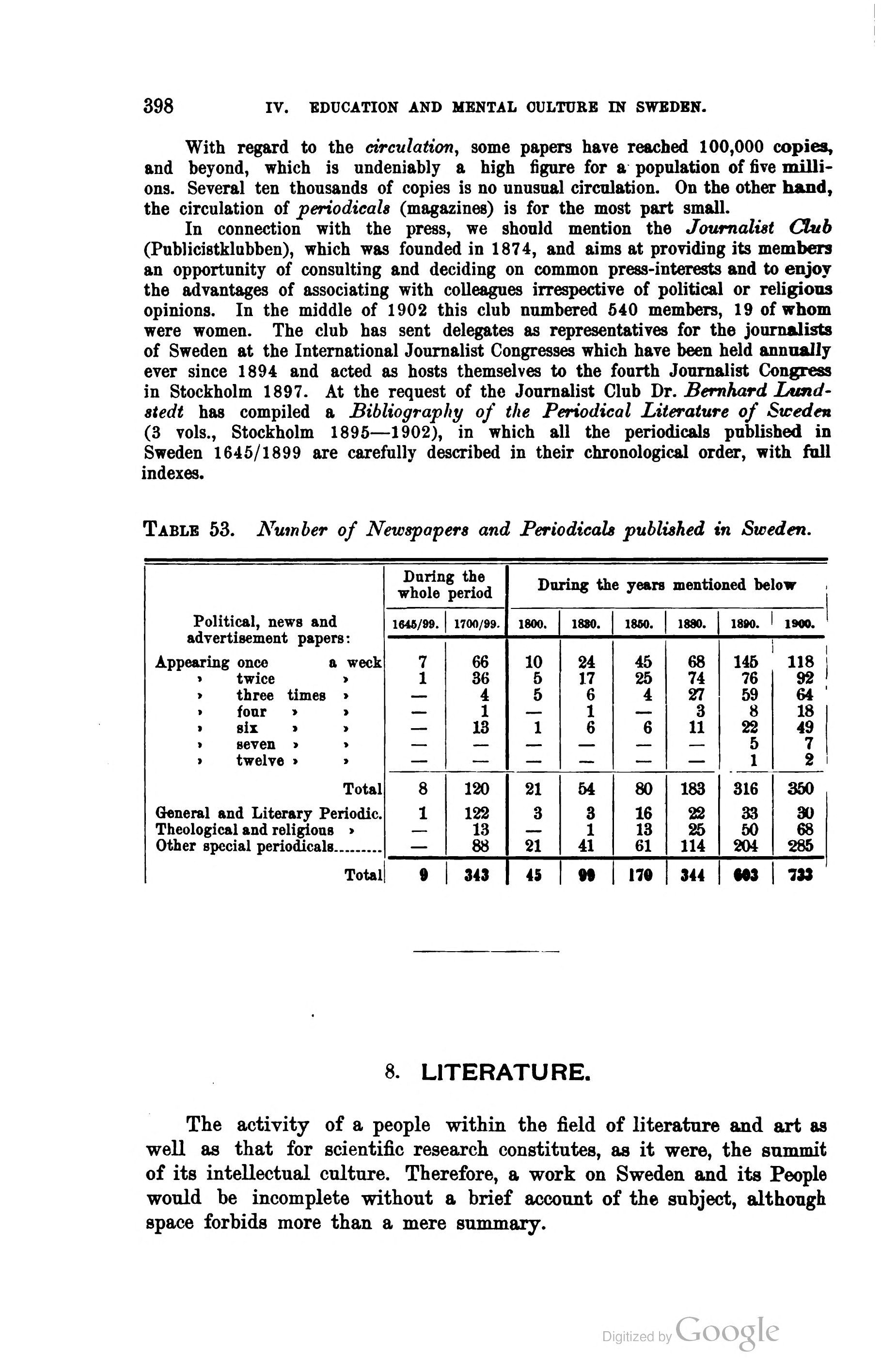 Full resolution (JPEG) - On this page / på denna sida - First part - IV. Education and Mental Culture - 7. Public Collections and Institutions for Science and Art. Periodical Literature. By B. Lundstedt, Ph. D., Librarian at the Royal Library, Stockholm - Newspapers - 8. Literature. By Lector R. Steffen, Ph. D., Örebro
