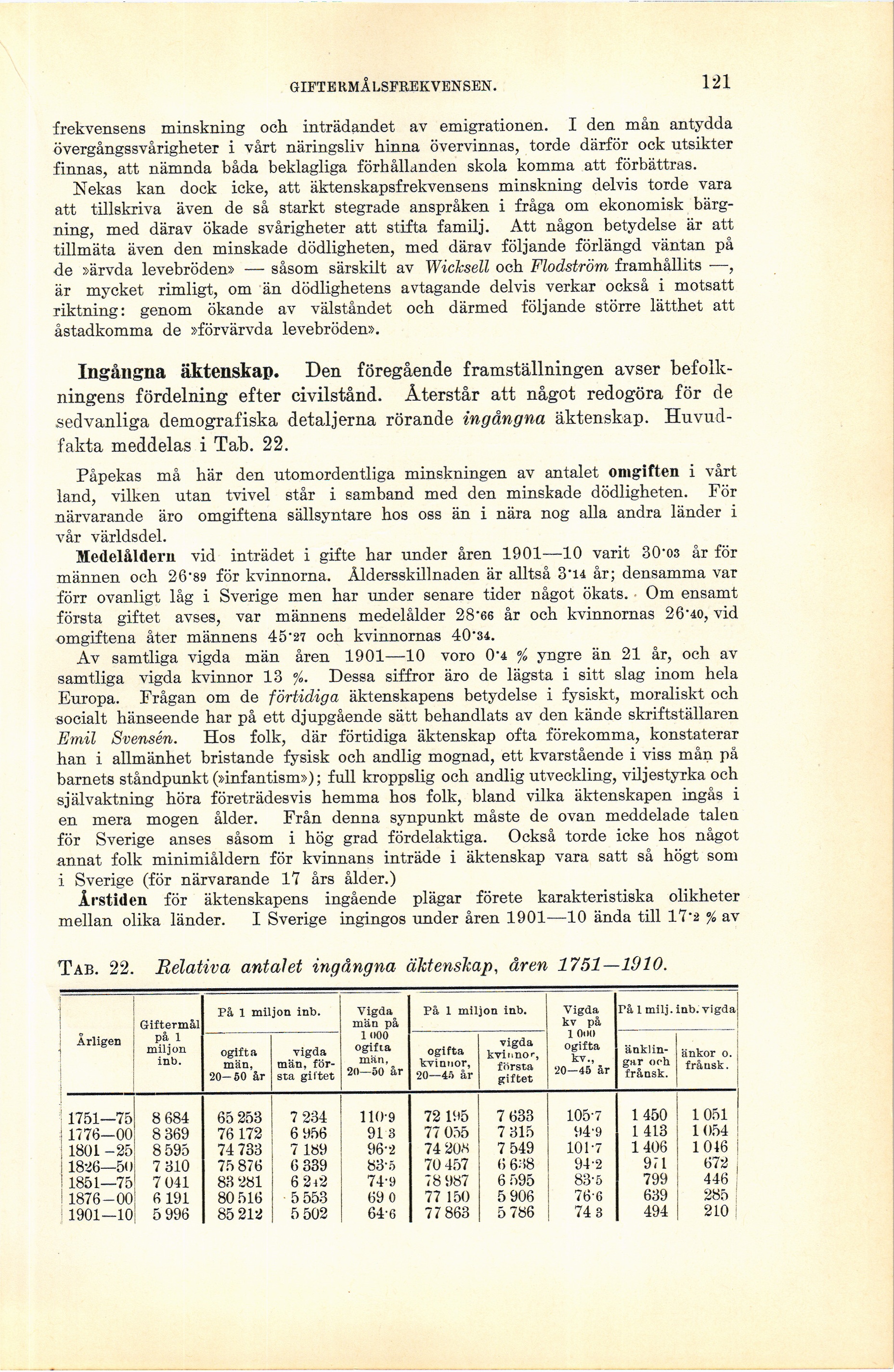 Tab. 22. Relativa antalet ingångna äktenskap, åren 1751—1910.
