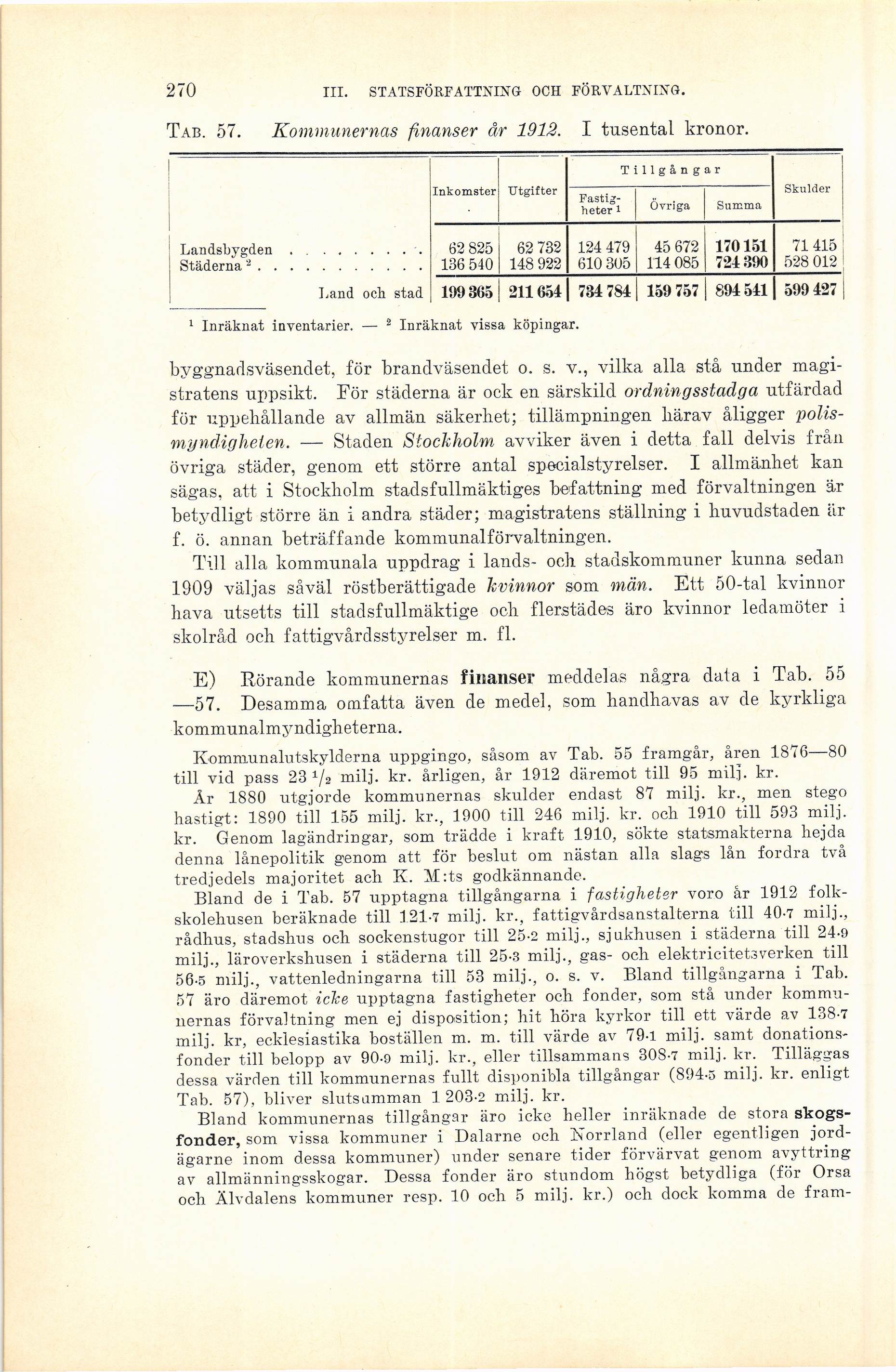 Tab. 57. Kommunernas finanser år 1912. I tusental kronor.
