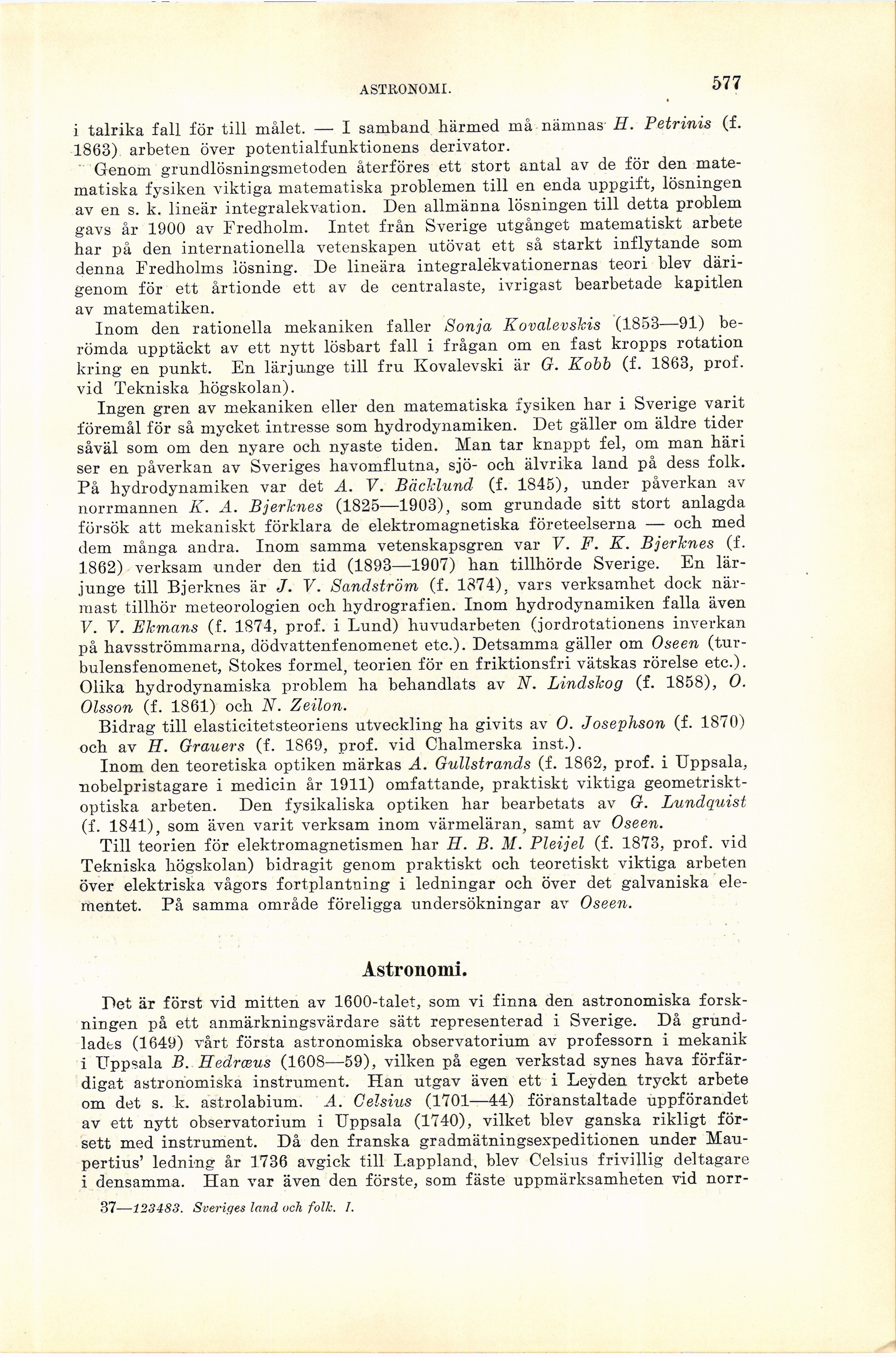 Full resolution (JPEG) - On this page / på denna sida - IV. Undervisningsväsendet och den andliga odlingen. Inl. av P. E. Lindström - 11. Den vetenskapliga forskningen - Mekanik och matematisk fysik. Av C. W. Oseen - Astronomi. Av Karl Bohlin