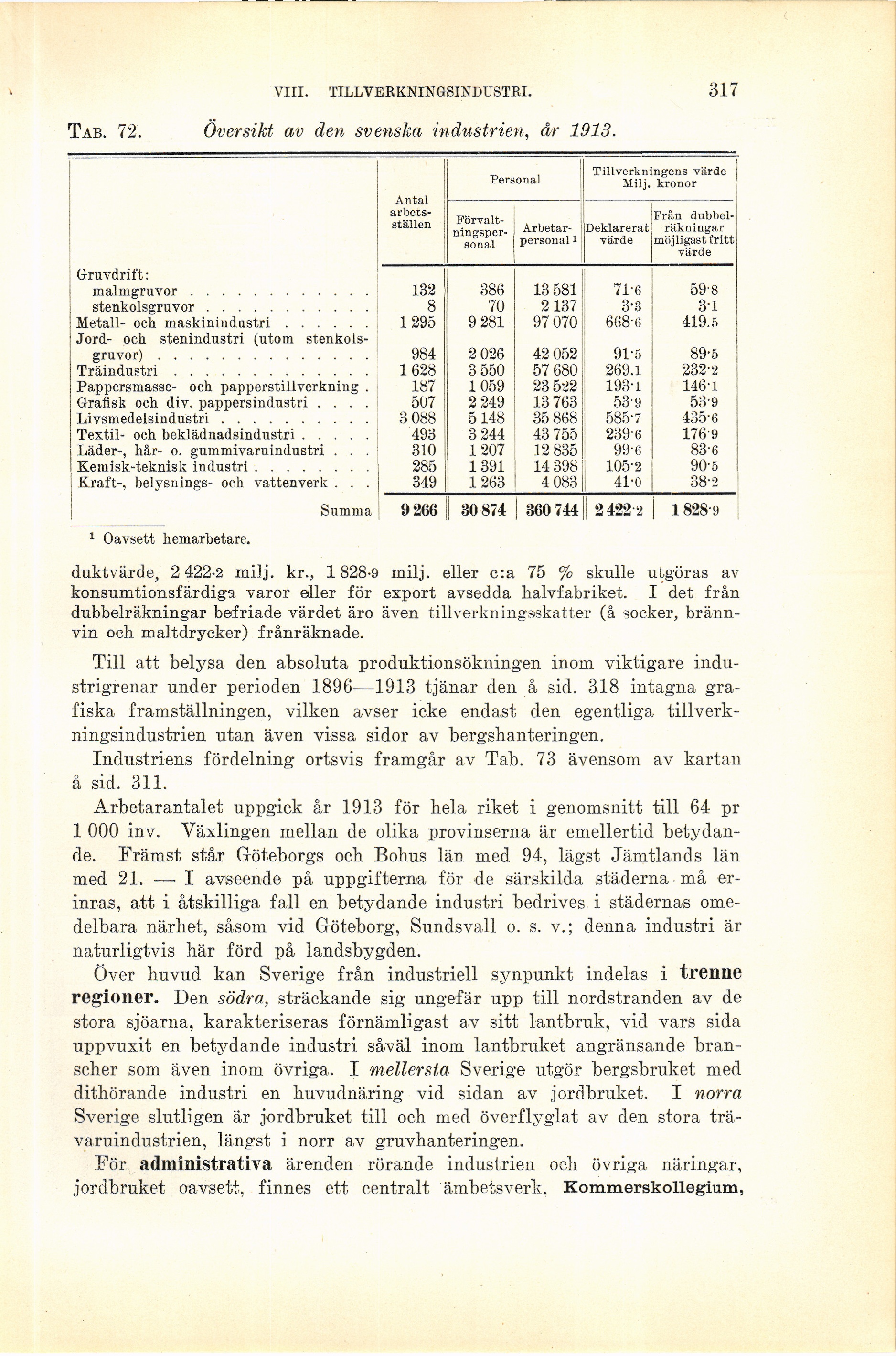 Tab. 72. Översikt av den svenska industrien, år 1913.